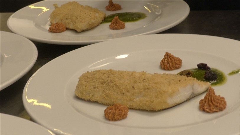 Pavé di branzino in crosta di canestrelli di Taggia -olive taggiasche - maionese piccante ai pomodori secchi e pesto e carciofi fritti