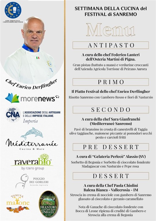 Il progetto, coordinato dal giornalista enogastronomico Claudio Porchia, prevede ogni anno la realizzazione di un piatto firmato da uno chef dell’associazione Euro-Toques, inserito nella carta dei ristoranti che aderiranno all’iniziativa. L’obiettivo è quello di coinvolgere nel 2024 tutti i ristoranti della città di Sanremo, della Liguria ed anche di tutta Italia e del mondo, che vorranno partecipare a questo progetto gourmet.Alla presentazione del pomeriggio hanno partecipato anche gli allievi dell'Istituto Professionale CNOS Don bosco di Vallecrosia accomapgnati dai docenti dei corsi di cucina e di sala.