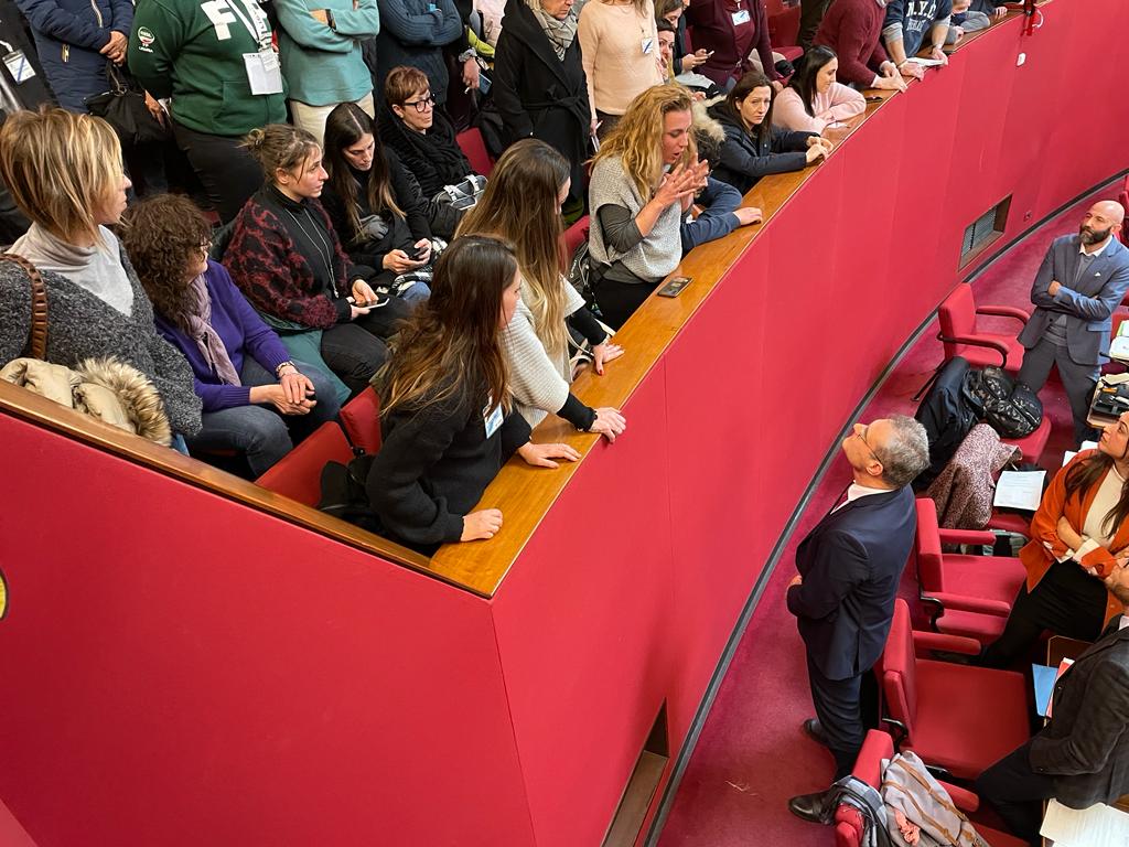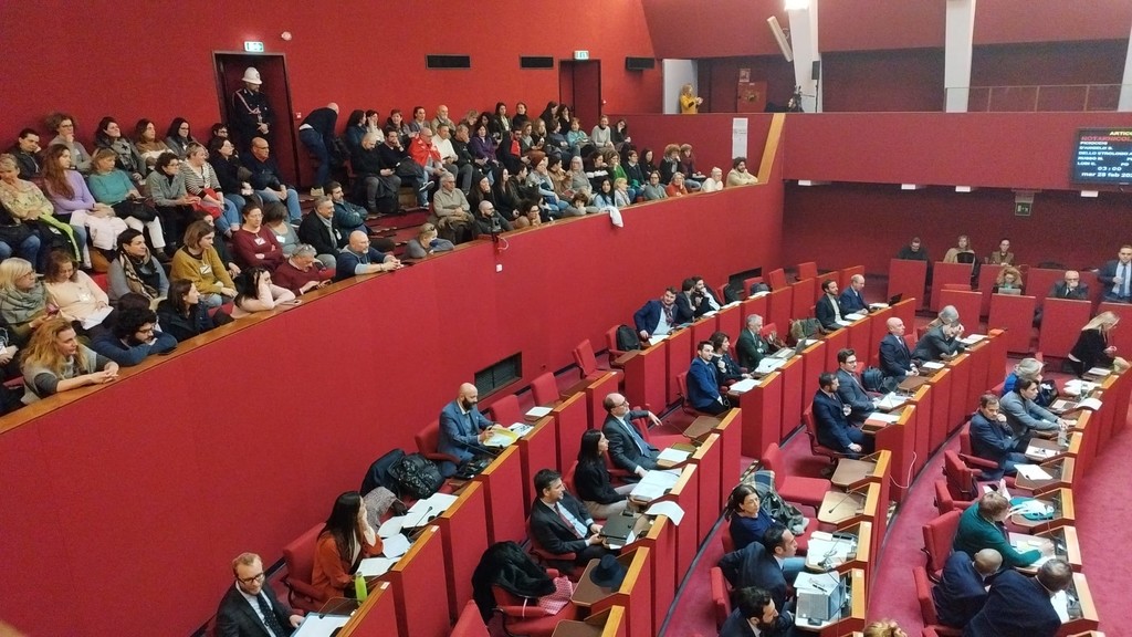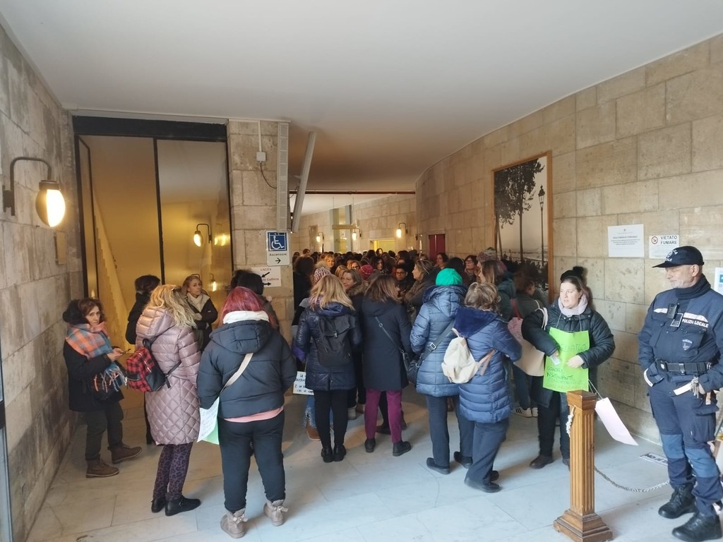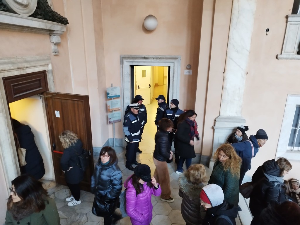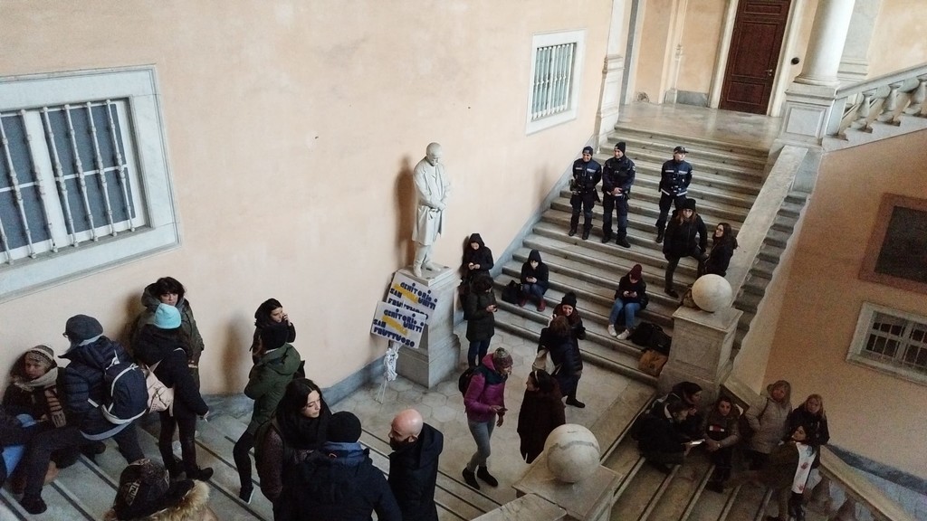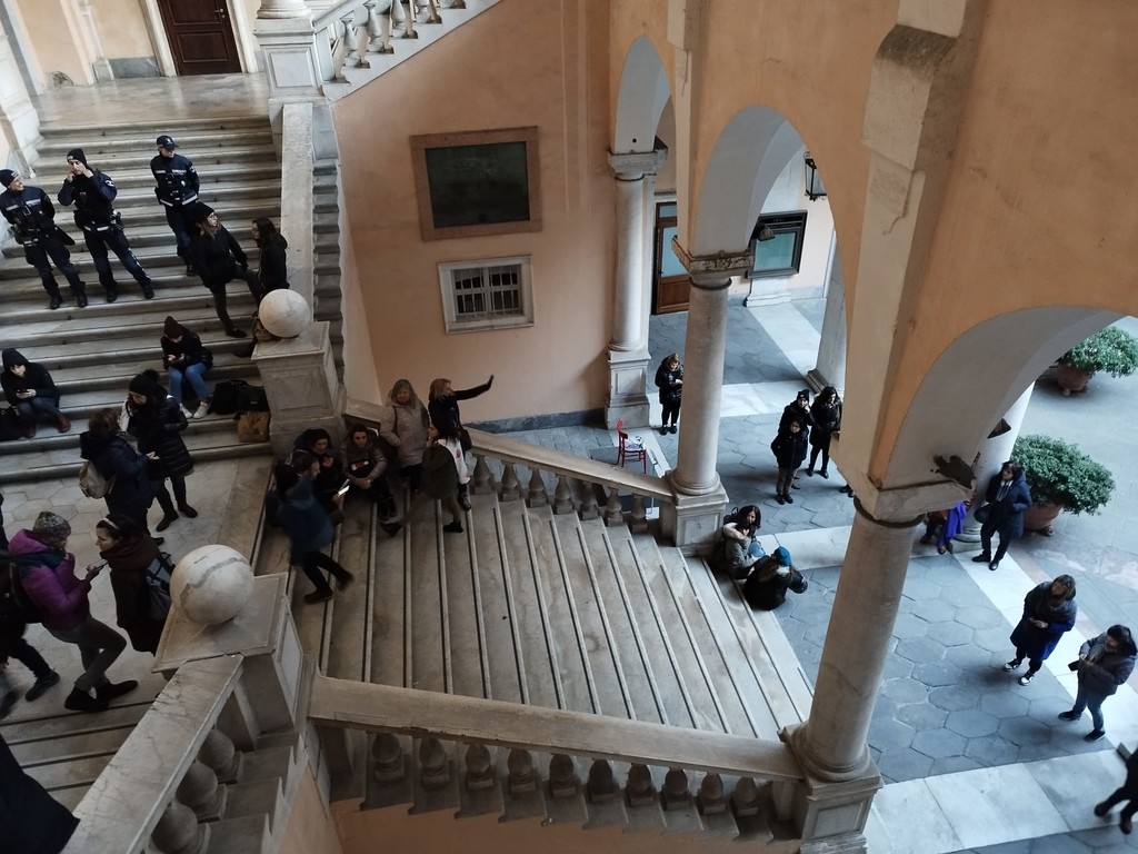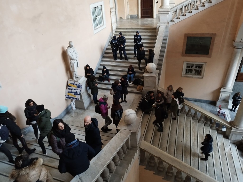 I lavoratori sono stati invitati dai sindacati a scendere nell'atrio di palazzo Tursi, da dove attendono l'esito della riunione di maggioranza e le parole in aula del vicesindaco Piciocchi.