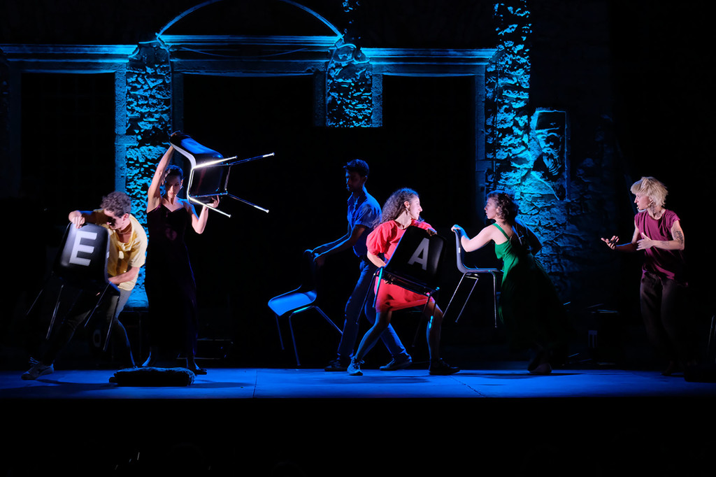 I tanti personaggi della commedia sono interpretati da una compagnia giovane che si muove lungo una scena semplice, leggera e priva di orpelli. Scelta fortemente voluta da Jurij Ferrini per comunicare la necessità di tornare all’essenziale, sostituendo il superfluo con un pieno di freschezza, ed energia costruttiva.