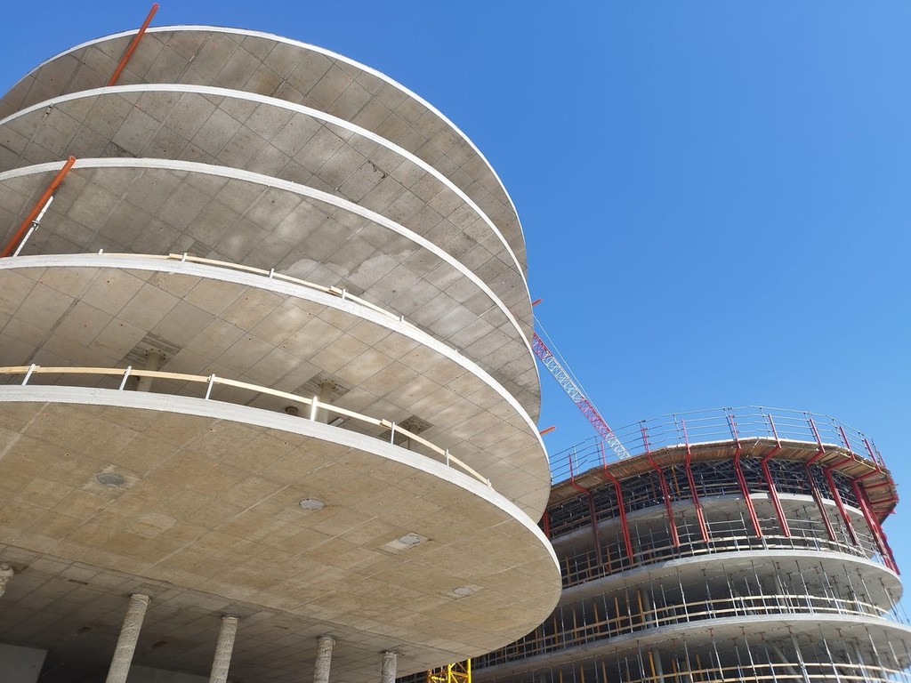 Dall’altra parte del canaletto, tra il Palasport e il Padiglione Jean Nouvelle, sono in fase di completamento le strutture in elevazione degli edifici residenziali a cui seguirà l’installazione delle facciate.