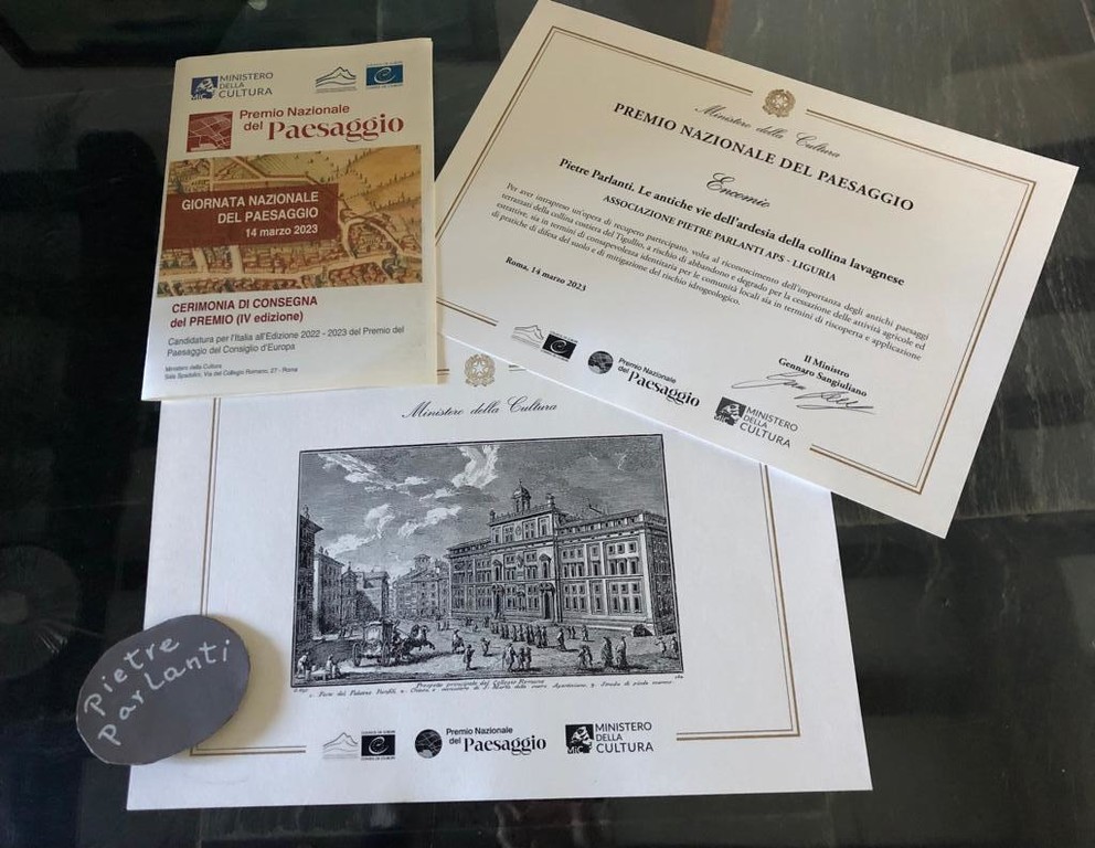 Anche per questo, il Ministero ha concesso l’encomio, che recita così: “Pietre Parlanti. Le antiche vie dell’ardesia della collina lavagnese. Per aver intrapreso un’opera di recupero partecipato, volta al riconoscimento dell’importanza degli antichi paesaggi terrazzati della collina costiera del Tigullio, a rischio di abbandono e degrado per la cessazione delle attività agricole ed estrattive, sia in termini di consapevolezza identitaria per le comunità locali sia in termini di riscoperta e applicazione di pratiche di difesa del suolo e di mitigazione del rischio idrogeologico”.