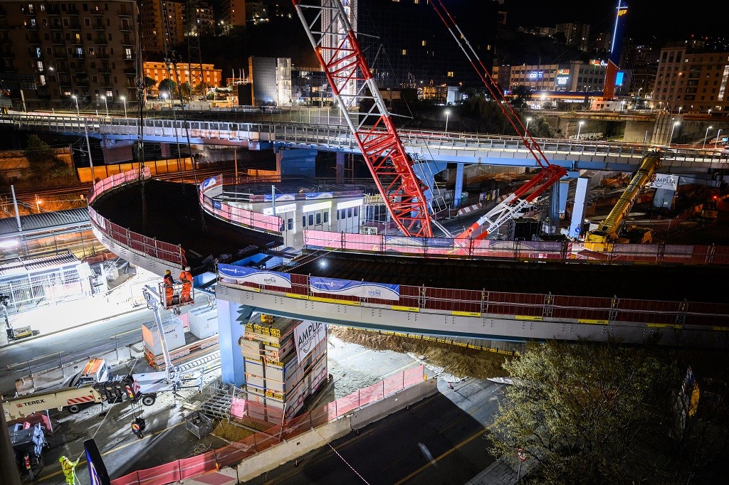 E' stato varato sabato e completato la notte scorsa, il secondo impalcato del Nodo di San Benigno, parte del complessivo sistema di collegamento che permetterà di connettere direttamente la sopraelevata Aldo Moro con il lungomare Canepa direzione ponente, alleggerendo il congestionamento sull’elicoidale. Il primo impalcato era stato posizionato domenica scorsa.