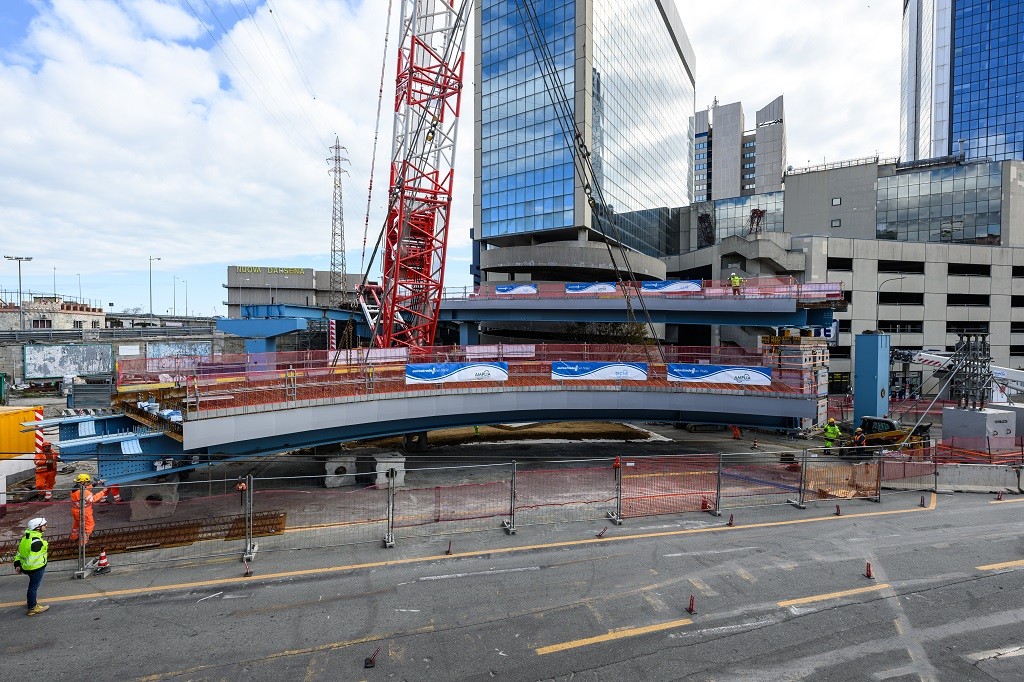 Al fine di creare meno interruzioni possibili alla viabilità di via di Francia, i due impalcati metallici, uno da 25 mt e l’altro da 30 mt circa e larghi 7,5 mt, con un peso di circa 100 tonnellate ciascuno, sono stati assemblati a terra per poi essere posizionati sulle pile precedentemente predisposte a tal fine. Per il varo l’impresa Vernazza per conto di AMPLIA S.p.A. ha montato una gru cingolata DEMAG modello CC3800-1 con 42 metri di braccio e una portata di 200 tonnellate.