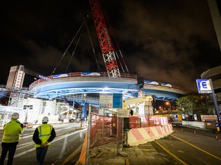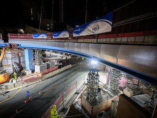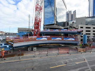 Al fine di creare meno interruzioni possibili alla viabilità di via di Francia, i due impalcati metallici, uno da 25 mt e l’altro da 30 mt circa e larghi 7,5 mt, con un peso di circa 100 tonnellate ciascuno, sono stati assemblati a terra per poi essere posizionati sulle pile precedentemente predisposte a tal fine. Per il varo l’impresa Vernazza per conto di AMPLIA S.p.A. ha montato una gru cingolata DEMAG modello CC3800-1 con 42 metri di braccio e una portata di 200 tonnellate.