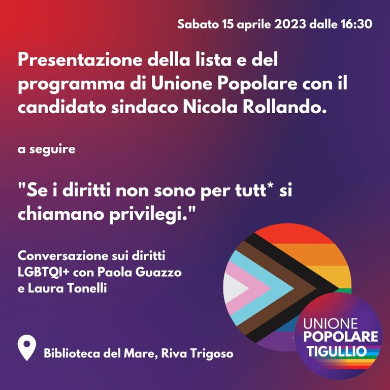 Alle 18.00 "Se i diritti non sono di tutt* si chiamano privilegi: conversazione sui diritti LGBTQI+" con Paola Guazzo (saggista lgbtqi+ ed esponente nazionale di Unione Popolare) e Laura Tonelli (attivista lgbtqi+ e candidata consigliera per Unione Popolare alle amministrative di Sestri Levante)