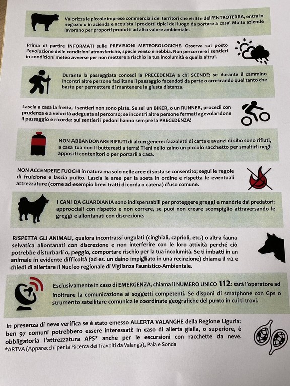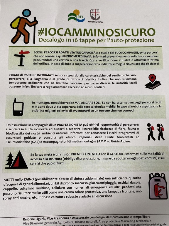 Per questo motivo è nata l’iniziativa 'Io cammino sicuro' promossa da Regione Liguria e dal Club Alpino Italiano: un elenco di buone norme per proteggersi, un questionario di autovalutazione da compilare prima di affrontare un’escursione e dei gazebo con personale preparato a cui chiedere consiglio prima di iniziare il proprio trekking nei punti di maggior interesse.