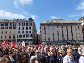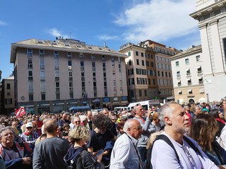 Molto applaudito l'intervento del presidente di Anpi Genova Massimo Bisca, che ha ricordato i partigiani uccisi durante la Resistenza, ma anche la reazione dei genovesi durante gli anni di piombo. “Ricordo quegli uomini e quelle donne che tanti anni fa liberavano Genova, ma voglio ricordare i loro compagni di lotta, che per tanti anni sono venuti qui in questa piazza a fianco a noi. Quelli che ai nostri padri e alle nostre madri che hanno educato ai valori della Resistenza, non hanno aspettato che qualcuno portasse loro la libertà, hanno scavato nelle loro coscienze, hanno discusso e si sono uniti perché l'unità è la lezione migliore che la Resistenza ci ha dato, e hanno pagato per questo, alla Casa dello Studente dove sono stati torturati, alla Benedicta dove sono stati fucilati, a Cravasco, a Isoverde, a Passo Mezzano, a Portofino, l'elenco è interminabile, ed erano insieme ricordiamocelo sempre, dai monarchici agli anarchici; hanno ucciso a botte don Ciarafoni, prete di Pegli, hanno messo in galera don Gaggero, ma vicino a lui hanno fucilato Giacomo Buranello, Valter Fillak e l'elenco è lungo. E allora da quei valori che hanno segnato in questa città e sulle montagne, molti pensavano a come sarebbe stato il nostro Paese dopo e chi è sopravvissuto alla guerra ha scritto il frutto migliore di quella lotta, che si chiama Costituzione della Repubblica che va difesa, va applicata, non va snaturata. Siccome in questo periodo, ma non solo, c'è chi pensa di stravolgere e cancellare la storia e di mettere sullo stesso piano i partigiani, le donne e gli uomini e chi invece li ha caricati sui treni come il 16 giugno 1944, chi ha caricato quegli operai, quei tecnici, quegli impiegati che hanno difeso le fabbriche e il porto, noi dobbiamo avere una nuova ondata di antifascismo e la si ha mettendo in pratica il primo articolo della Costituzione che dice che l'Italia è una Repubblica fondata sul lavoro non sullo sfruttamento, no non rispettando chi lavora e la sua attività”.