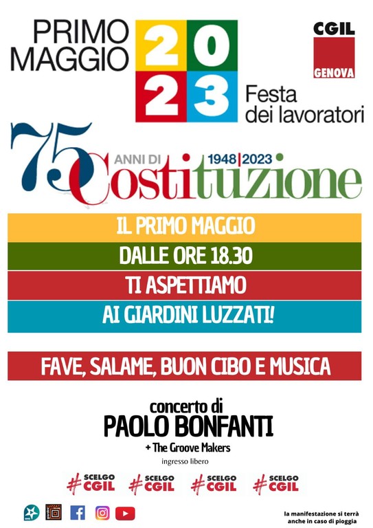 La Cgil di Genova annuncia che quest’anno la festa delle lavoratrici e dei lavoratori organizzata dalla Camera del Lavoro avrà luogo nel centro storico, presso i Giardini Luzzati, e sarà dedicata ai 75 anni della promulgazione della Costituzione.