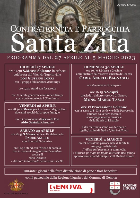 «La festa di Santa Zita – dice il priore della Confraternita Maria Cristina Mazzola – è l’evento centrale delle attività della Confraternita -. La festa di Santa Zita è un culto millenario iniziato a Lucca e che si perpetua, in collaborazione con la parrocchia dedicata alla santa, secondo un rituale antico che comprende la santa messa in dialetto genovese, la processione nel quartiere Foce e la distribuzione di fiori e pane benedetti. È una tradizione che nel tempo è diventata una propria “festa della città”, nella quale i genovesi possono ritrovare un senso di unicità e identità».