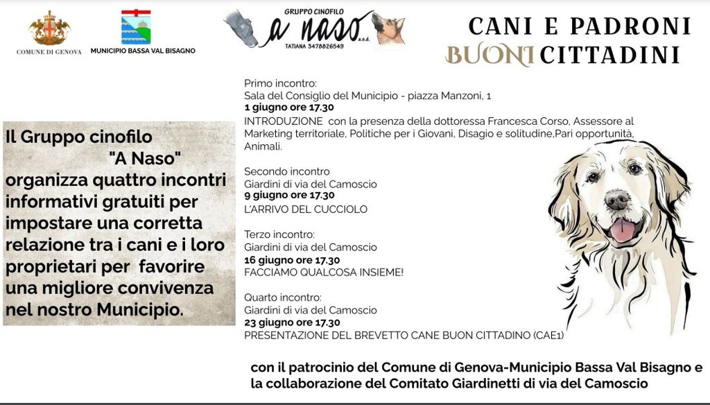 Il Municipio 3 Bassa Val Bisagno con la collaborazione del gruppo cinofilo “A naso” organizza quattro incontri informativi gratuiti per impostare una corretta relazione tra i cani e i loro proprietari al fine di favorire una migliore convivenza nel nostro Municipio.