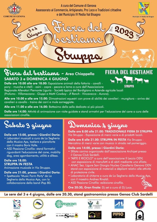 -Domenica 4 giugno dalle 8 alle 21 la tradizionale Fiera di Struppa, in via Struppa, con esposizione di merci varie e di prodotti locali.