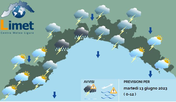 Cielo e Fenomeni: durante la notte aumento della nuvolosità, dal mattino primi fenomeni temporaleschi che si svilupperanno rapidamente sia dal Ligure centrale verso la costa, sia sull'arco ligure occidentale. Precipitazioni più intense e persistenti, localmente a carattere di nubifragio, tra genovesato e savonese. Durante il pomeriggio i fenomeni più organizzati tenderanno a concentrarsi nelle zone interne, variabilità invece sulla costa con scrosci alternati a pause.