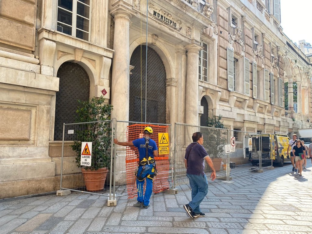 Lavori in corso sulla facciata di Palazzo Tursi.
