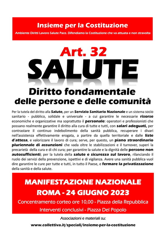 La Cgil insieme a un’ampia rete di associazioni laiche e cattoliche riunite nell'Assemblea ‘Insieme per la Costituzione’ sarà in piazza sabato 24 giugno a Roma per una grande manifestazione nazionale in difesa del diritto alla salute, per il rilancio del Servizio Sanitario Nazionale, pubblico e universale, e per garantire salute e sicurezza nei luoghi di lavoro.