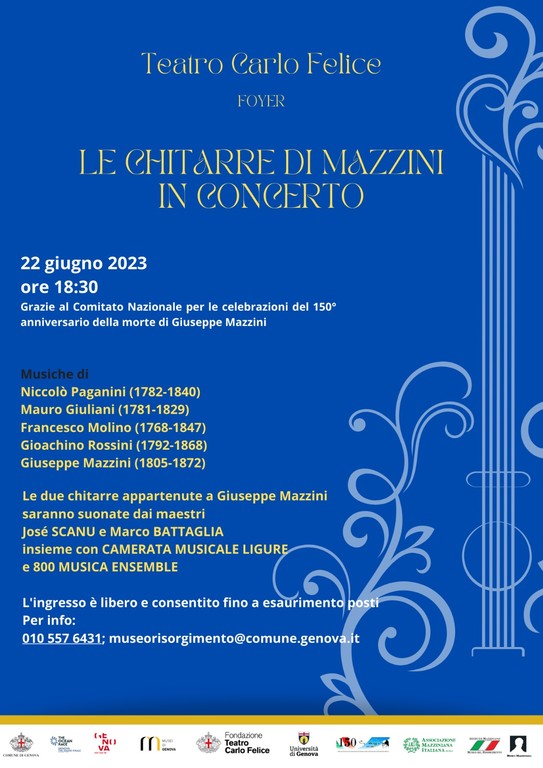 A partire dalle 18.30, invece, “Le chitarre di Mazzini” potranno essere ascoltate nel foyer del teatro Carlo Felice. Uno spettacolo con musiche di Giuseppe Mazzini, Niccolò Paganini, Gioachino Rossini, Mauro Giuliani, Francesco Molino: le due chitarre appartenute a Giuseppe Mazzini saranno suonate dai maestri José Scanu e Marco Battaglia insieme con Camerata Musicale Ligure e 800 Musica Ensemble. Ingresso libero fino ad esaurimento posti.