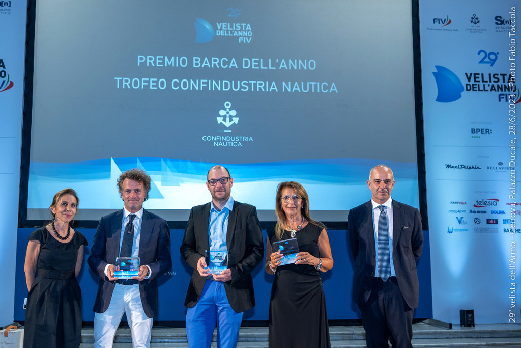 Al termine dei saluti istituzionali, i primi a salire sul palco sono stati i finalisti del premio Barca dell'Anno – Trofeo Confindustria Nautica. Eleonora Cottarelli ha invitato sul palco Marina Stella, Direttore Generale di Confindustria Nautica e Alessandro Campagna direttore commerciale de I Saloni Nautici. Cottarelli ha sottolineato come Confindustria Nautica stia vivendo un periodo molto intenso di attività ed eventi istituzionali e come il Velista dell’Anno FIV sia soltanto il primo di questi. “ lo sport della vela impone delle scelte. Allo stesso modo, Confindustria Nautica ha scelto di concentrare a Genova tutti gli eventi associativi di primavera, il Velista dell’Anno, in collaborazione con la Federazione Italiana Vela,la cerimonia della XXXII edizione del Premio “Pionieri della Nautica”, dedicato a manager, giornalisti, progettisti e professionisti del mare che si sono distinti nella storia e nello sviluppo dell’industria nautica in Italia, e la Convention SATEC. Tutto questo, proprio nella settimana in cui la Città ospita l’evento The Ocean Race Grand Finale, per sottolineare il legame che da sempre unisce industria nautica, cultura del mare e sport della vela e crediamo nella forza del modello di collaborazione pubblico-privato per il raggiungimento di importanti risultati, come testimonia il Salone Nautico Internazionale di Genova.