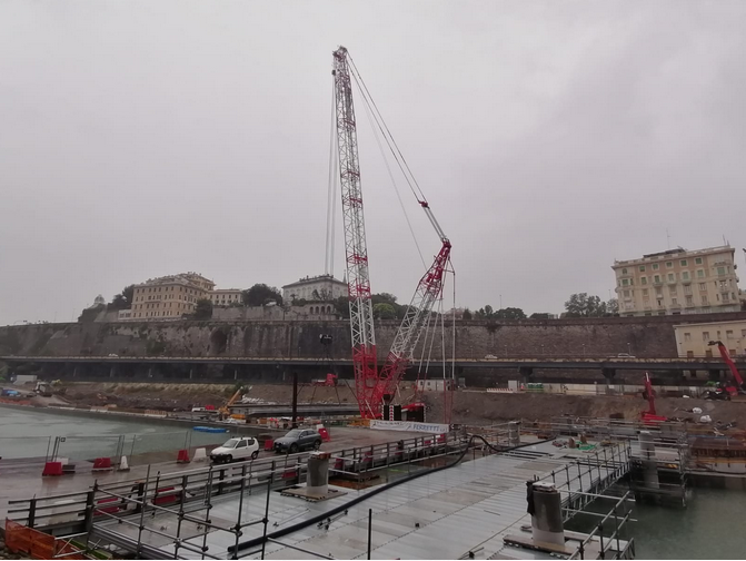 La pioggia battente non ha fermato le operazioni di varo del nuovo ponte Nord che collegherà il padiglione Jean Nouvelle alla città, all'interno del Waterfront di Levante.
