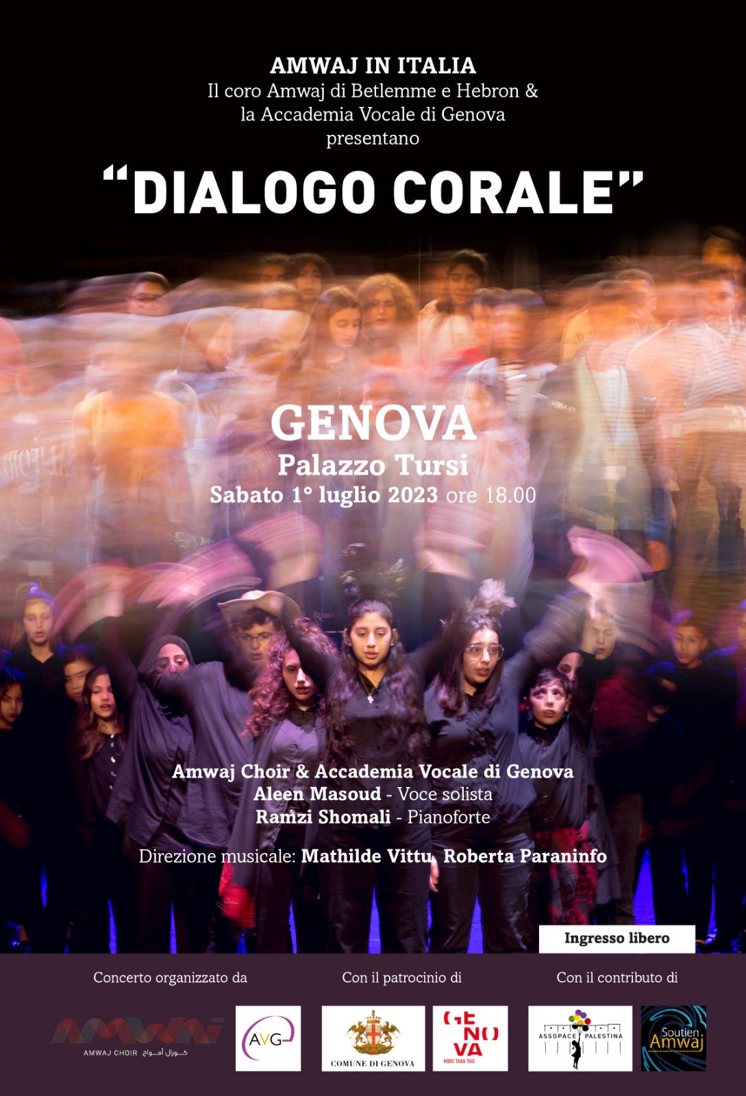 Grande attesa per il concerto che si terrà sabato 1 luglio alle ore 18.00 nel cortile interno di Palazzo Tursi, grazie al patrocinio del Comune di Genova, inserito all’interno delle Giornate dei Rolli: protagonisti i bambini e i ragazzi del Coro Amwaj di Betlemme ed Hebron, diretti da Mathilde Vittu e Michele Cantoni, a fianco dei cori dell’Accademia Vocale di Genova - realtà genovese ormai affermata in ambito corale sia nazionale che internazionale, che di questo progetto ha curato l’organizzazione e l’accoglienza genovese - diretti da Roberta Paraninfo.