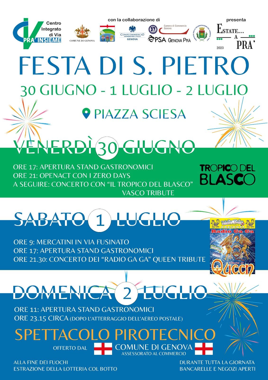 Torna, domenica 2 luglio, alle 8 alle 24, a Pra’, la fiera di San Pietro, organizzata dall’assessorato al Commercio del Comune di Genova. L'area fieristica è di 5.000 metri quadri su piazza Sciesa e vie limitrofe. La fiera, che come da tradizione si svolge nella domenica successiva alla ricorrenza che festeggia il patrono di Pra’, San Pietro, ospiterà circa 80 banchi di merci varie e generi alimentari.