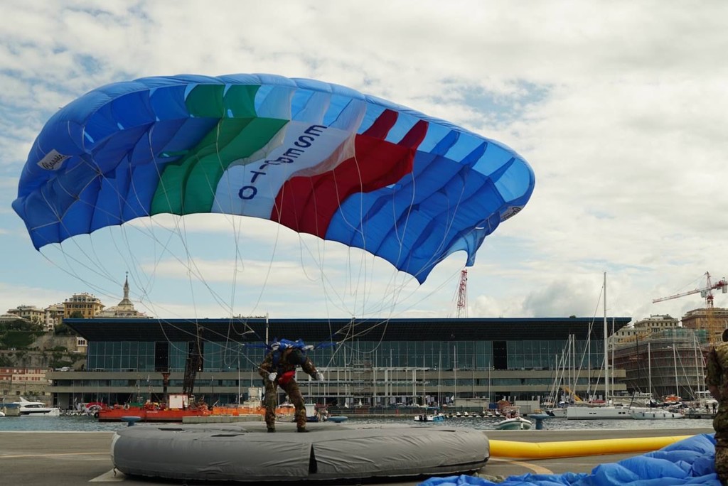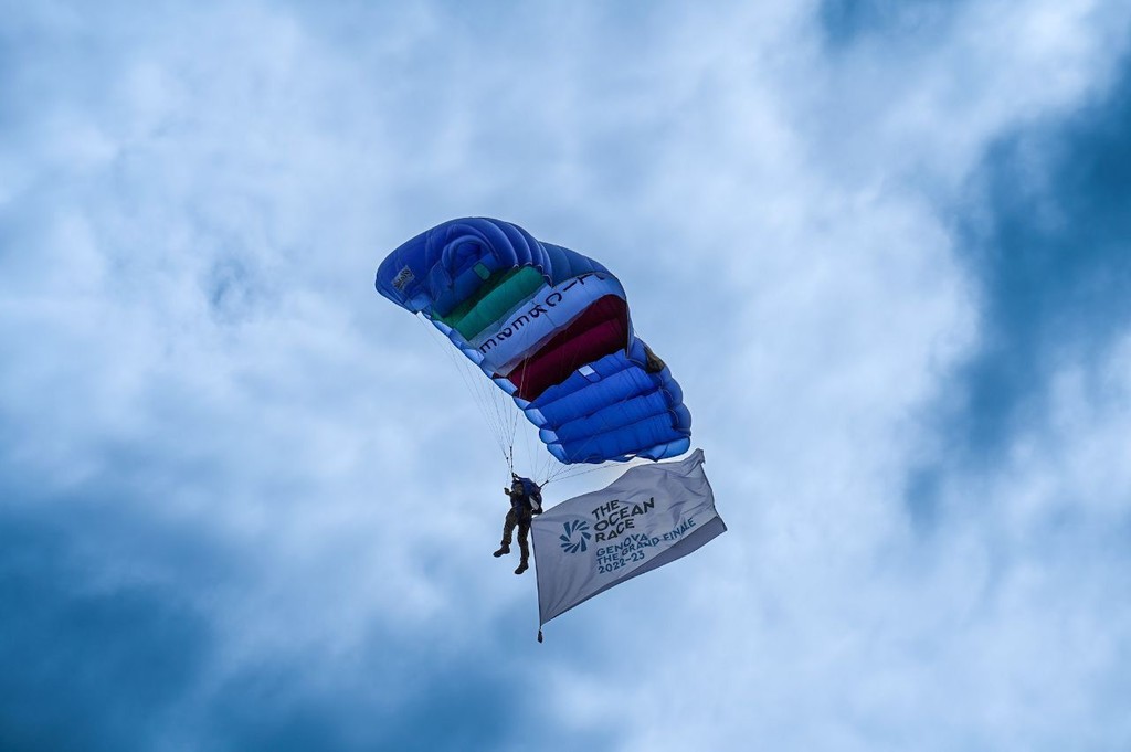 Ad aprire la giornata di celebrazioni nell’Ocean Live Park del Waterfront di Levante è stato lo spettacolare lancio dei paracadutisti della Brigata Folgore dell’Esercito Italiano. Alle 10.21 e fino alle 10.28 i militari si sono lanciati da un elicottero a 1200 metri d'altezza con la bandiera Tricolore e quella di The Ocean Race Genova - The Grand Finale.