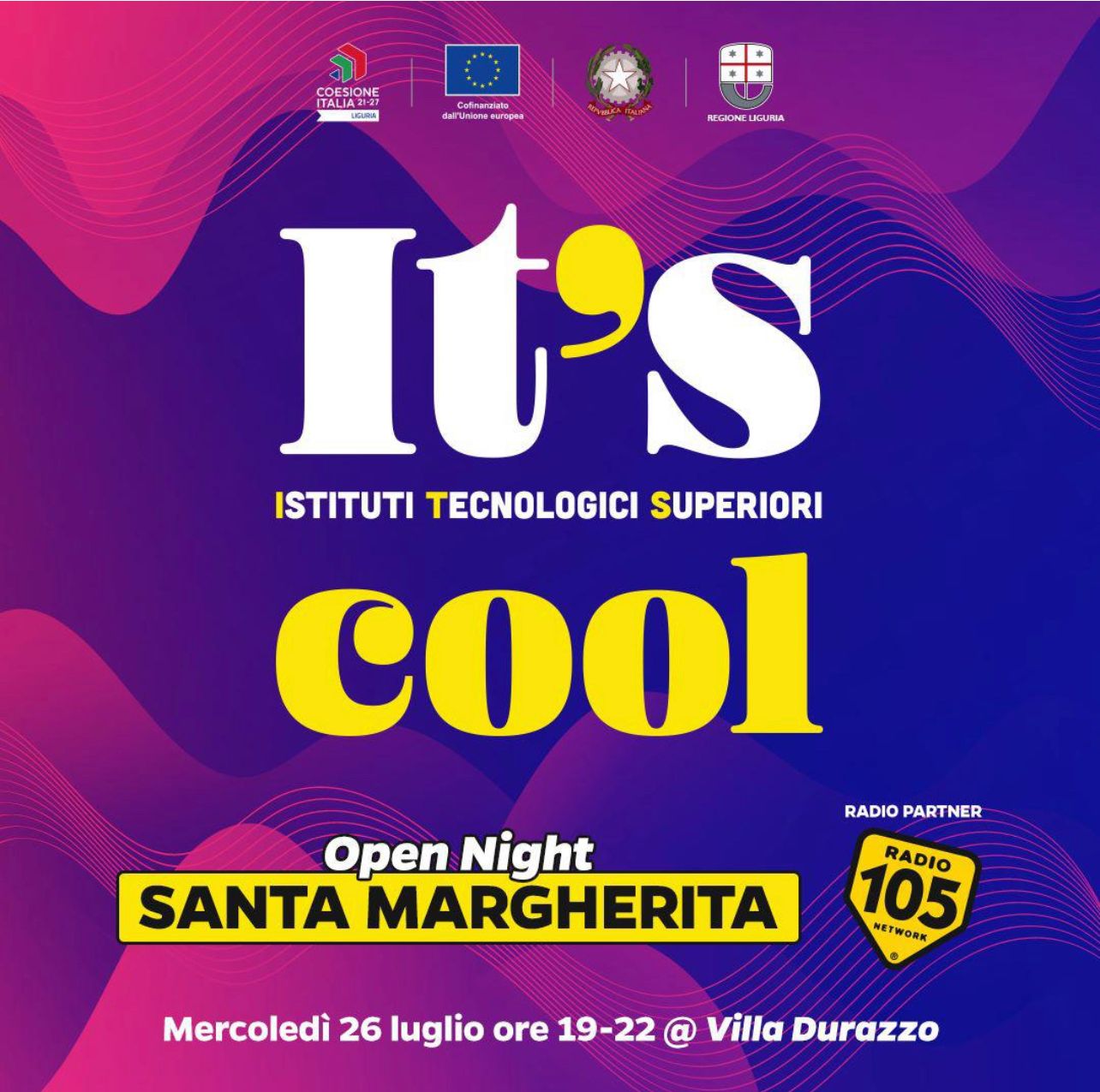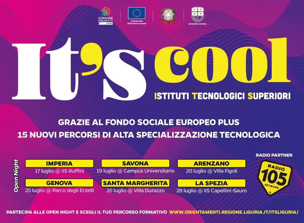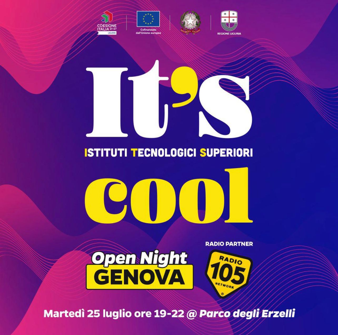 Con “IT’S COOL” Regione Liguria vuole trasformare i classici “open day” in occasioni per far conoscere gli ITS Academy con il divertimento e la musica, vere e proprie “open night” offerte ai ragazzi che hanno appena terminato la Maturità e stanno decidendo il proprio futuro. Ogni serata prevede infatti testimonianze degli studenti degli ITS intervistati dai talent di 105 Alessandro Sansone, Bryan e Valeria, con la possibilità di visitare gli Istituti.