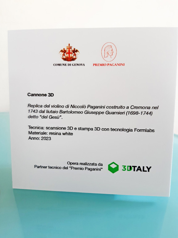 Il Premio Paganini festeggia i suoi 70 anni replicando in 3D il violino Guarneri del Gesù, il celebre Cannone appartenuto a Niccolò Paganini e conservato a Palazzo Tursi. La replica, fedele in scala 1:1, è stata realizzata tramite scansione e stampa 3D in resina bianca e corde in nylon rosso, i colori della bandiera di San Giorgio e del nuovo logo del Premio.