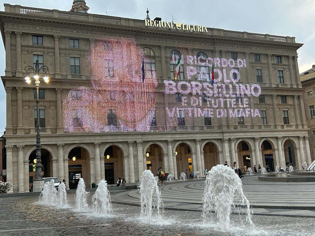 “In ricordo di Paolo Borsellino e di tutte le vittime di mafia”. Con questa scritta si è illuminato il Palazzo della Regione Liguria per rendere omaggio a Paolo Borsellino, a 31 anni dall’attentato mafioso di via D’Amelio. Nella strage persero la vita anche cinque agenti della sua scorta: Agostino Catalano, Emanuela Loi, Vincenzo Li Muli, Walter Eddie Cosina e Claudio Traina.