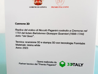 Il Premio Paganini festeggia i suoi 70 anni replicando in 3D il violino Guarneri del Gesù, il celebre Cannone appartenuto a Niccolò Paganini e conservato a Palazzo Tursi. La replica, fedele in scala 1:1, è stata realizzata tramite scansione e stampa 3D in resina bianca e corde in nylon rosso, i colori della bandiera di San Giorgio e del nuovo logo del Premio.