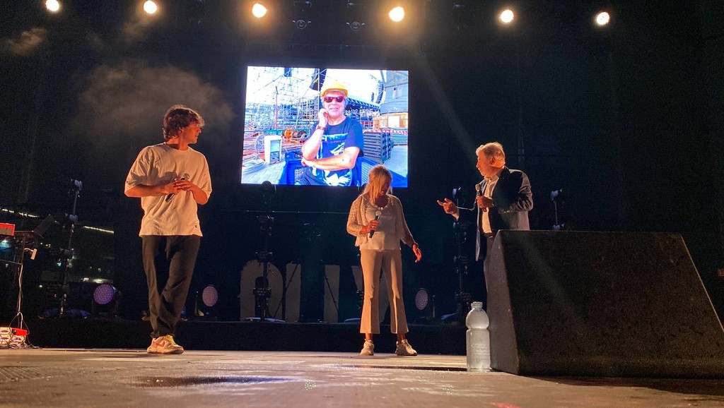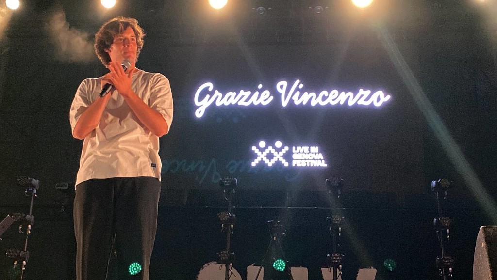 Chiamato sul palco, il sindaco del Comune di Genova si è unito all’omaggio: “Grazie a lui abbiamo imparato tante cose, voi siete qui stasera perché lo ha insegnato lui e sarebbe bello che tutti insieme dicessimo un grande ‘grazie’”.