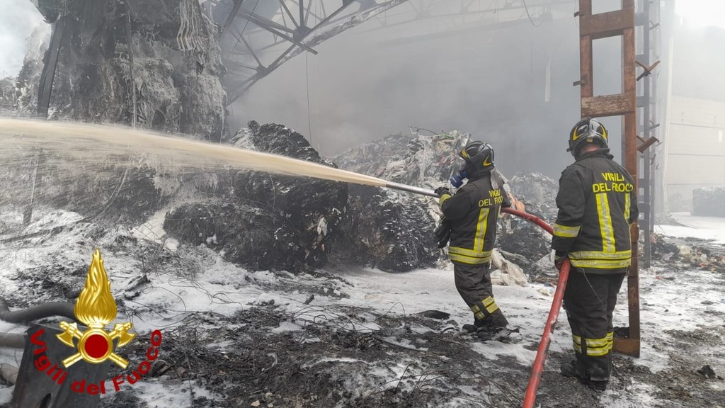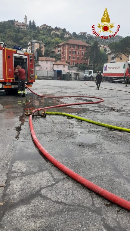 Sant'Olcese, ancora in corso di bonifica l'incendio nel deposito di materiali di riciclo (Foto)
