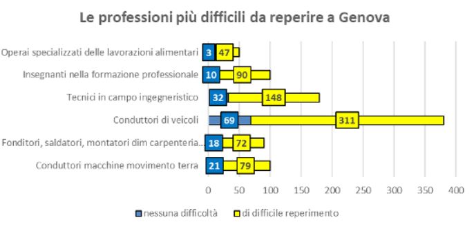 A livello generale, scende al 54% la percentuale di lavoratori difficili da trovare (comunque al di sopra del dato nazionale, pari al 48%), principalmente dovuta alla scarsità di candidati (36%). Tra le figure più difficili, le imprese genovesi segnalano, in ordine di difficoltà: gli operai specializzati delle lavorazioni alimentari (94% di difficoltà su 50 richieste), gli insegnanti nella formazione professionale (90% su 100), i conduttori di veicoli (82% su 380) e i tecnici in campo ingegneristico (82% su 180).