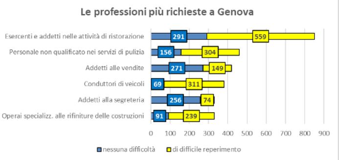 Al primo posto tra le professioni più ricercate dalle imprese genovesi ritroviamo gli addetti alle attività di ristorazione con una richiesta di 850 posti, in crescita rispetto ad agosto (di cui il 66% difficile da reperire); seguono 460 posti per personale di pulizia (66%), 420 addetti alle vendite (35%), 330 addetti alla segreteria e agli affari generali (22%) e operai specializzati nelle rifiniture delle costruzioni (72%).