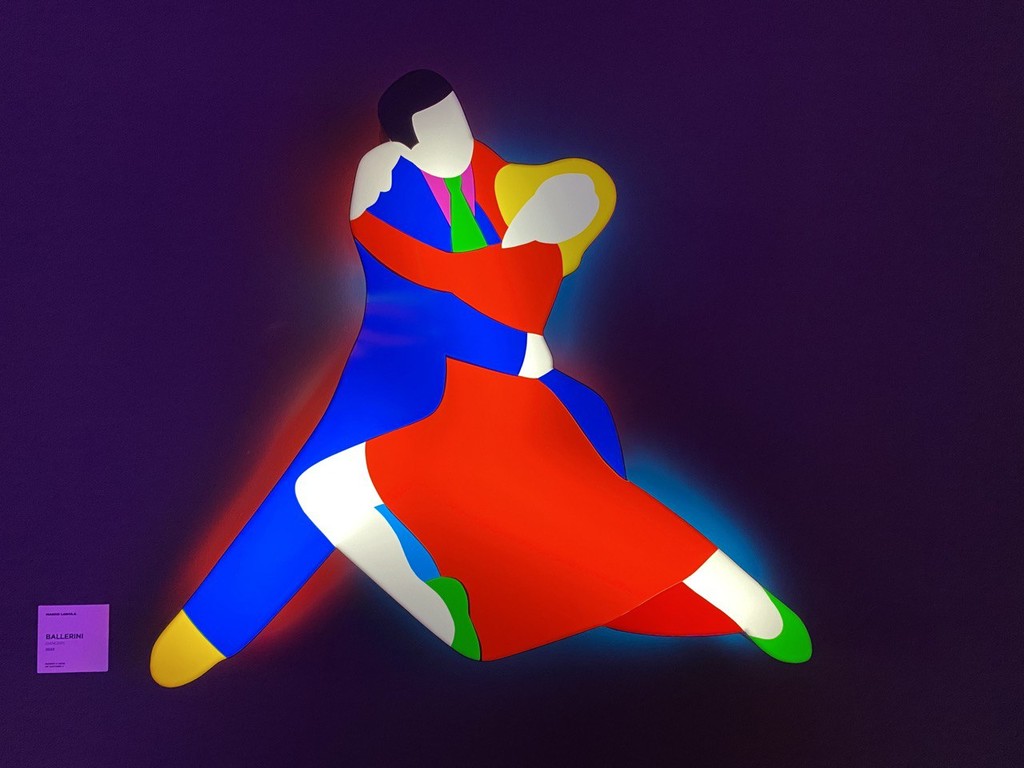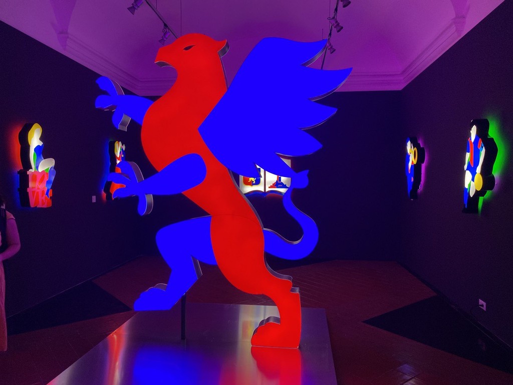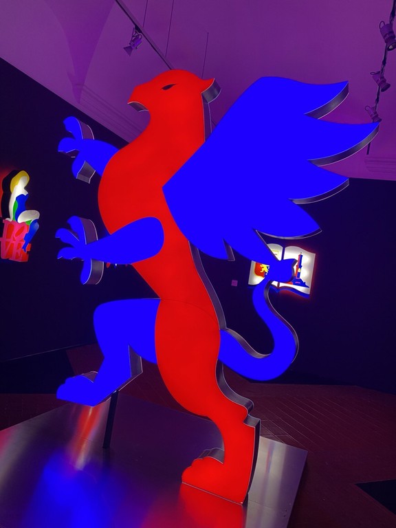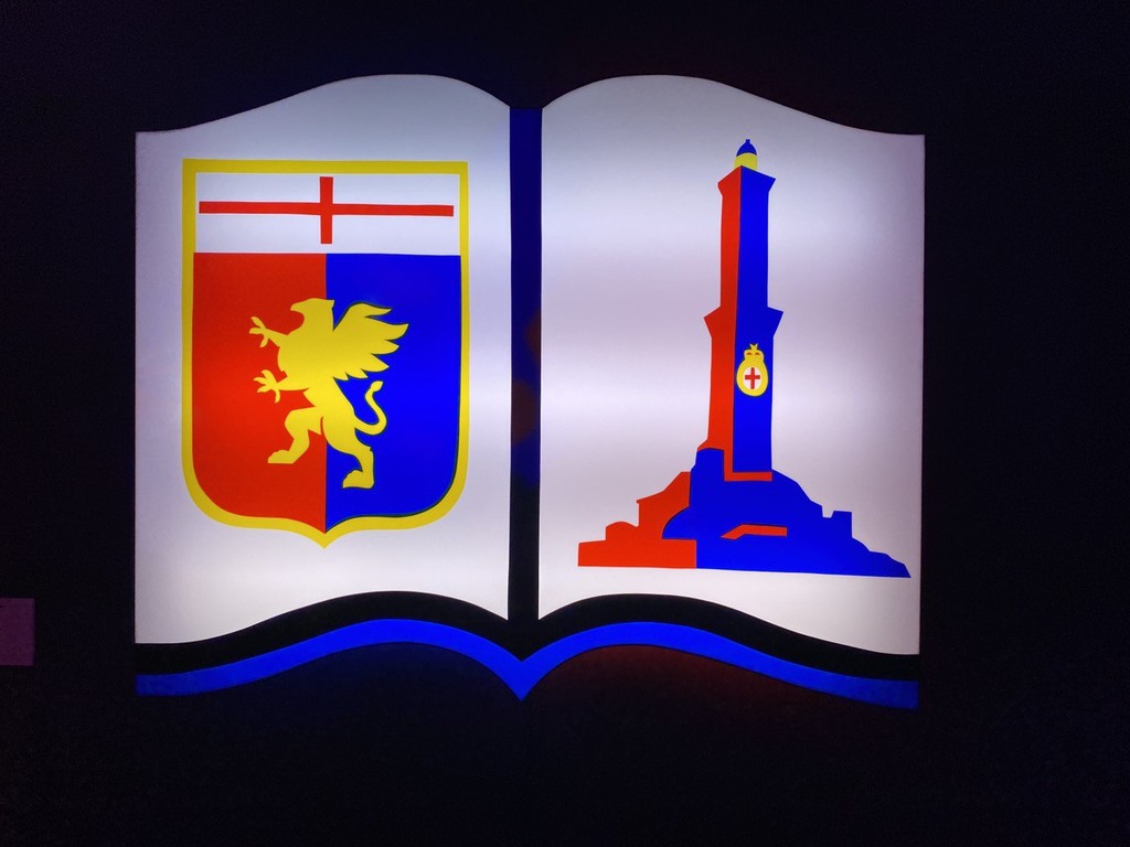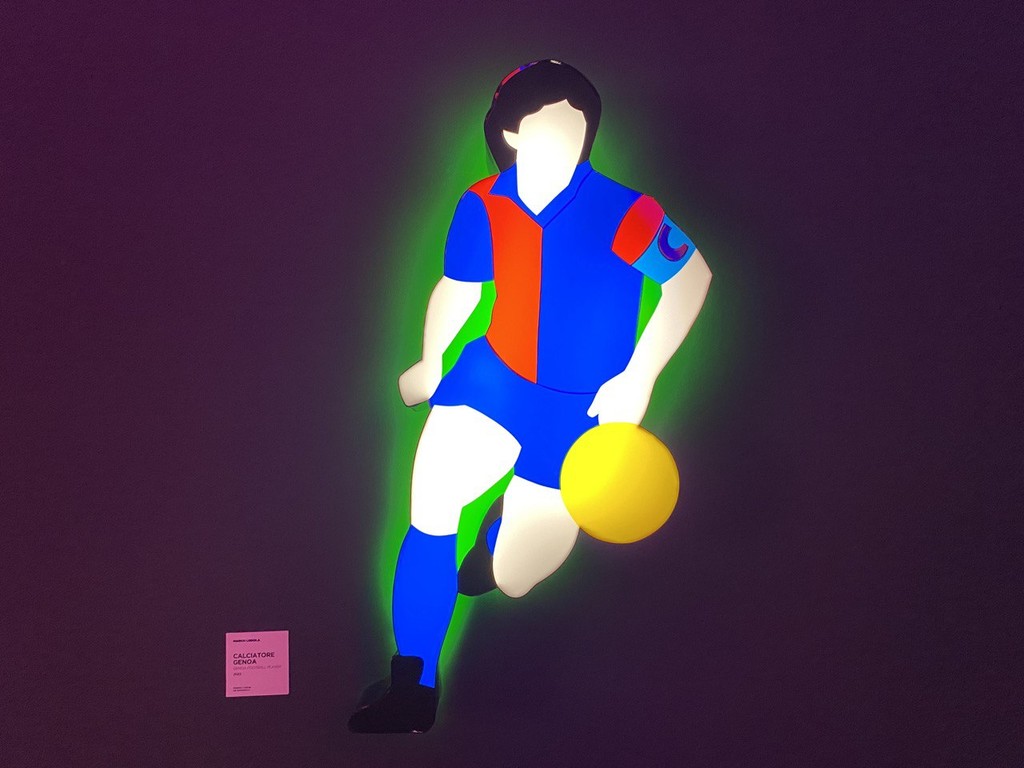Dieci composizioni luminose di uno dei principali esponenti dell’arte contemporanea, che ha esposto i suoi lavori in prestigiosi spazi museali di tutto il mondo e che ha spesso abbinato la sua arte al mondo del cinema, della musica, della moda e del teatro. Tra queste impossibile non rimanere colpiti dal Grifone alto quasi tre metri che si trova proprio all’ingresso dello spazio espositivo; dal volto di Fabrizio De André, unico dei personaggi delle rappresentazioni luminose ad avere il volto disegnato e riconoscibile e dalla Lanterna che viene proposta accanto allo stemma del Genoa sulle pagine di un volume aperto, quale riferimento a Genova Città del Libro 2023.