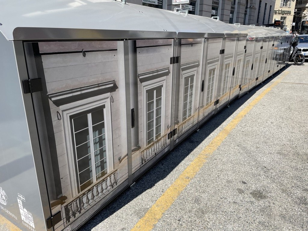Continua a dividere la nuova disposizione dei cassonetti di piazza Fontane Marose dove da qualche giorno, al posto dei bidoni per il conferimento dei rifiuti, sono spuntati i rivestimenti in metallo ‘camuffati’ con le immagini delle finestre del palazzo retrostante.