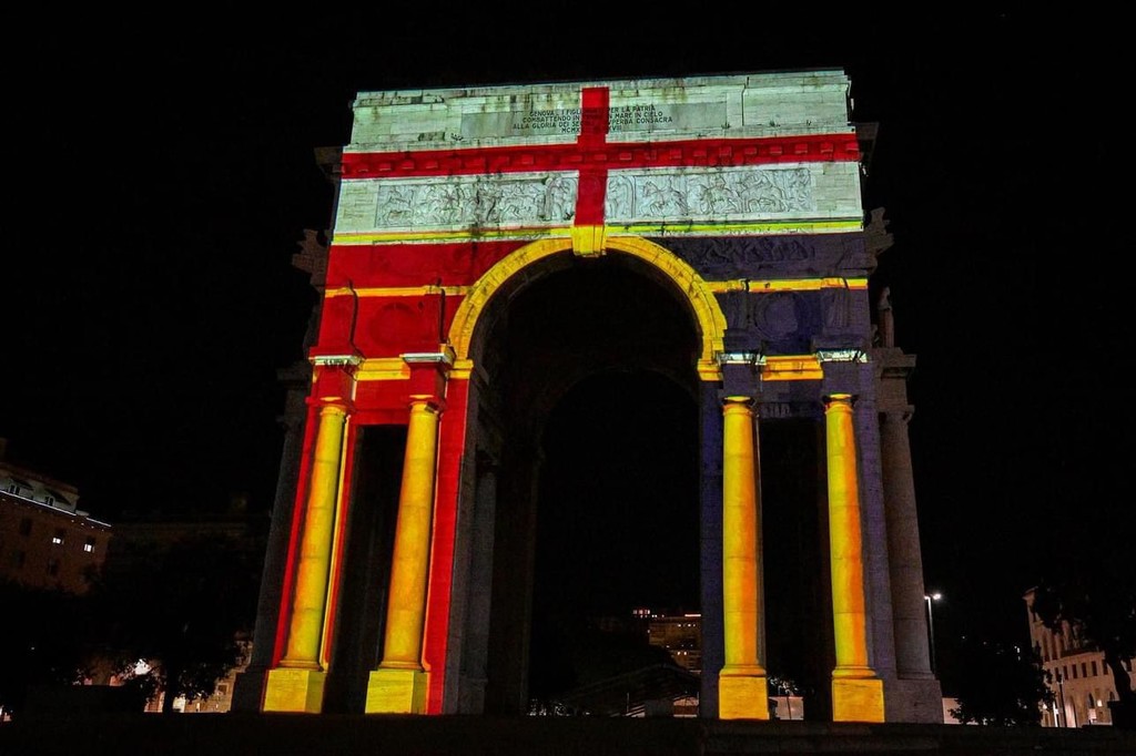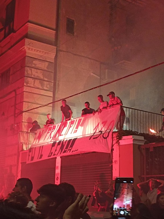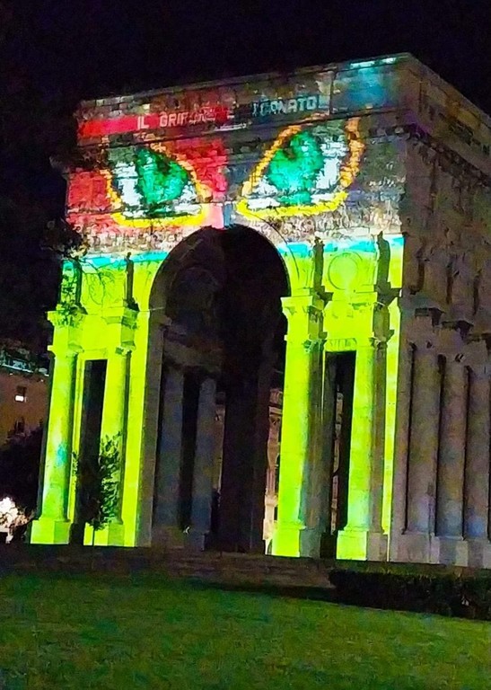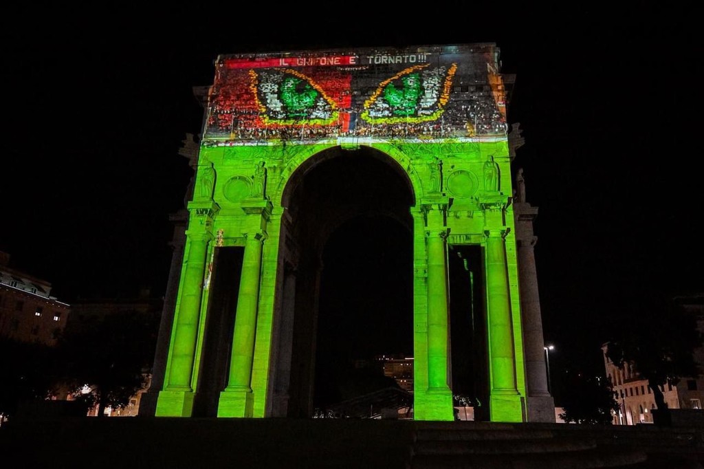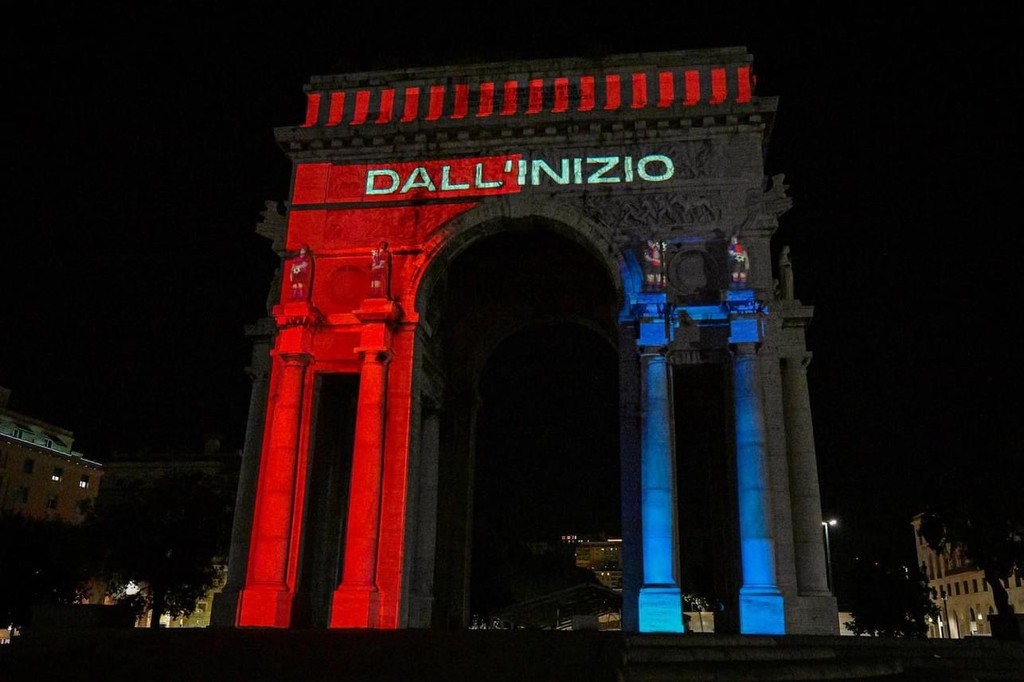 Cori e bandiere al vento, gli occhi del Grifone proiettati sull'arco di piazza della Vittoria che si colora di rossoblù come tutti i fumogeni che hanno illuminato la notte del centro di Genova, vestito a festa dai tifosi del Genoa per festeggiare, puntuali alla mezzanotte del 7 settembre, i 130 anni del Club più Antico d'Italia.