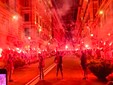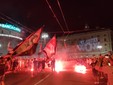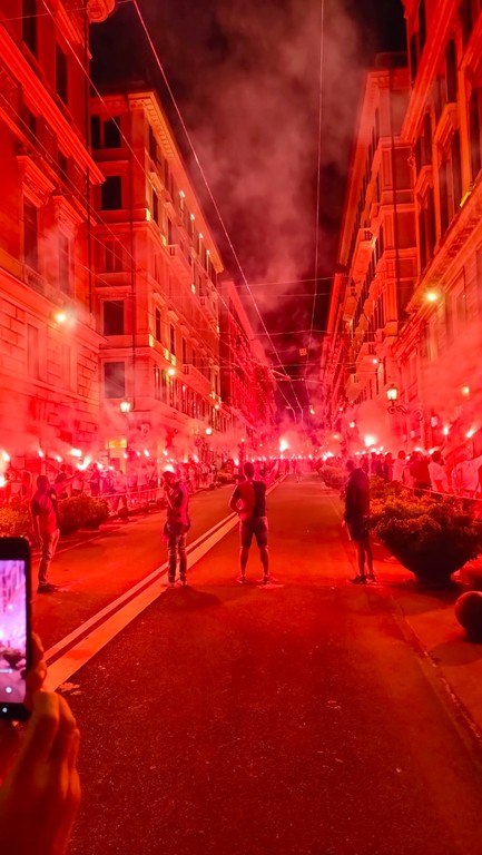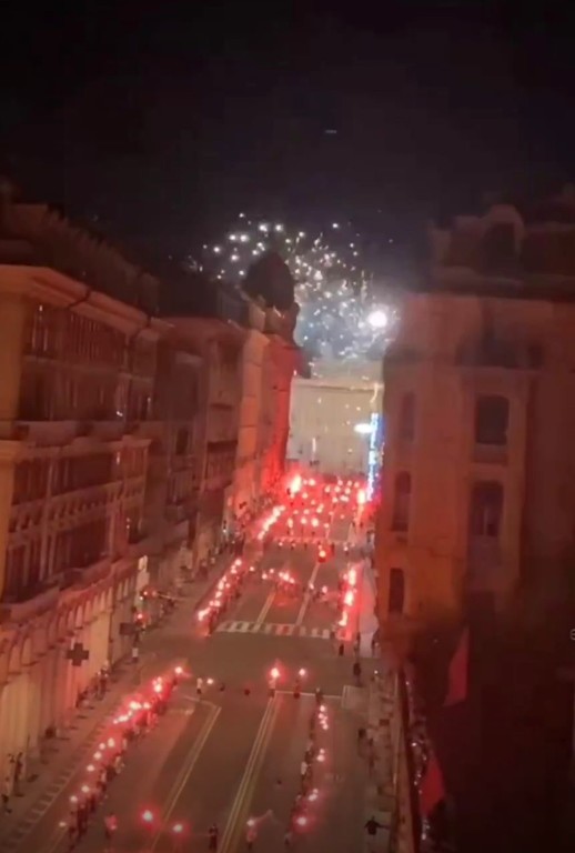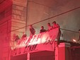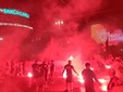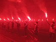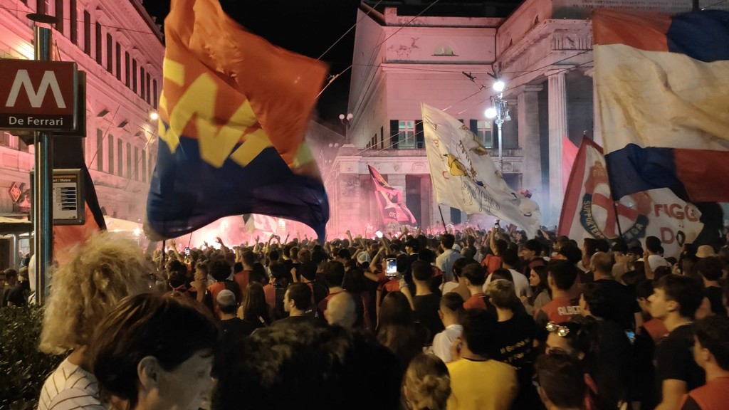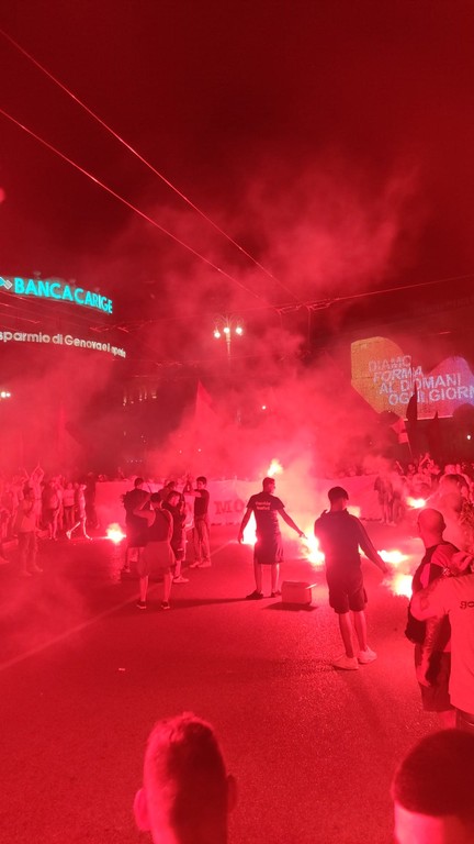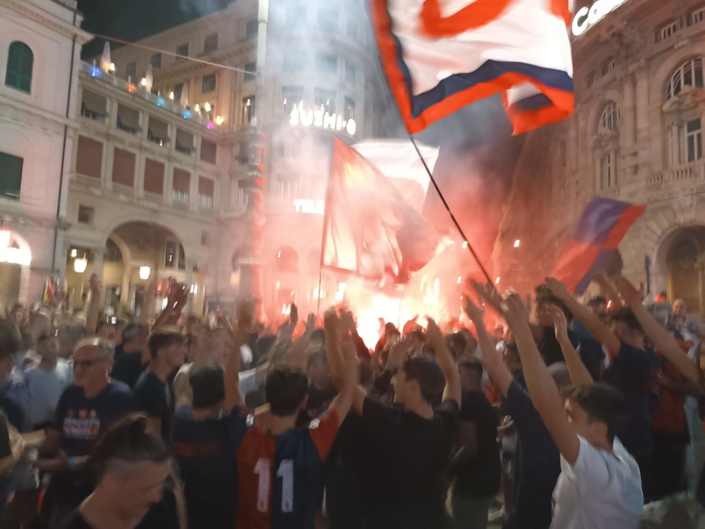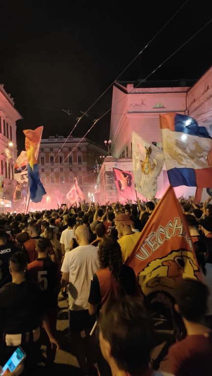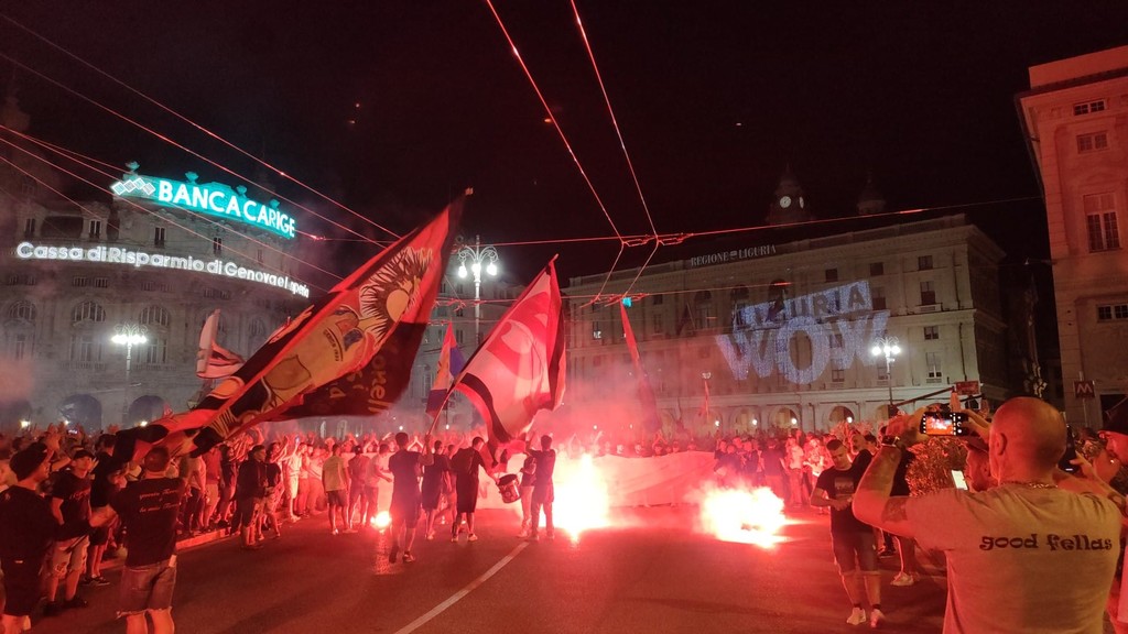 Una cortina colorata e uno spettacolo di fuochi d'artificio, una coreografia che ha illuminato la notte genovese del centro espandendosi da piazza De Ferrari nelle vie vicine con l'appuntamento fissato dalla tifoseria organizzata nel nome del Grifone.
