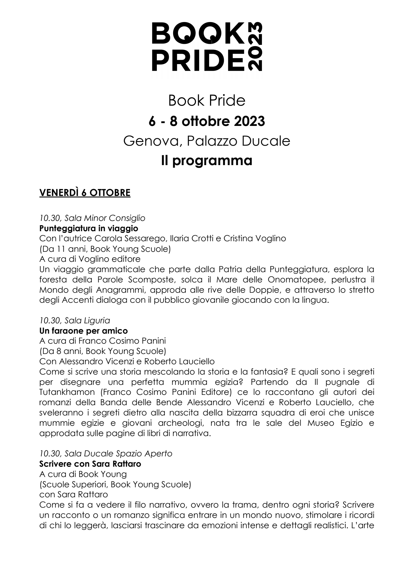 A Mario Mieli, il più grande intellettuale queer italiano, a 40 anni dalla morte, è dedicato un incontro su come se la cava oggi il desiderio, tra ruoli, identità, diritti con Irene Serini, Luisa Stagi e Francesco Pivetta (domenica 8, ore 15.30, Sala Luzzati).Ai talenti visionari di Renzo Picasso e Alberto Ponis si ispira il viaggio nei “sogni della ragione” dei due innovatori del Novecento che hanno guardato al futuro con le loro idee di case, strade e città, con Luigi Berio ed Emanuele Piccardo (sabato 7, ore 15.30, Sala Luzzati). A Marise Ferro, attenta osservatrice delle dinamiche femminili del Novecento, ingiustamente dimenticata, è dedicato un incontro sull’educazione sentimentale con Francesca Sensini ed Emilia Marasco (domenica 8, ore 11.30, Sala Luzzati). Alle voci dal carcere è riservato un appuntamento per capire come possono le parole – scritte, agite o ascoltate – favorire una relazione tra chi sta dentro e chi sta fuori, con Federica Manzitti, Mirella Cannata e Sandro Baldacci del Teatro Necessario, Tullia Ardito, direttore della Casa Circondariale Genova Marassi (venerdì 6, ore 18.30, Sala Luzzati). Anche le biblioteche sono al centro del dibattito e in particolare si mette a confronto la tradizione con il futuro, la Berio con l’esperienza dei duecento anni che compie quest’anno. Valentina Sonzini tiene le redini del dialogo, con la partecipazione della Beic nella sua progettazione futura grazie al contributo di Lucia Sardo e Paolo Carpi (venerdì 6, ore 17.30, Sala Camino). Al Mediterraneo, specchio di civiltà, scambi, storie, vite, passaggi, ma anche di migrazioni, speranze, conflitti e naufragi ineludibili, si guarda con gli occhi di tre festival: Itinerari Paralleli, Suq Festival, Mediterranea (venerdì 6, ore 16.30, Sala Liguria). Al cinema come arte e luogo per incontrarsi, trasformarsi, scoprire, è dedicato l’incontro con Flight, il Festival internazionale di cinema d’autore diffuso, audace e indipendente, e Nuova Cinematografica Gioiello, un vecchio cinema osè trasformato in circolo culturale (domenica 8, ore 14.30, Sala Genova). Sulla città che cambia, sui tanti volti delle migrazioni contemporanee e sulle convivenze possibili si confrontano lo scrittore Ilja Pfeiffer e il giornalista di Repubblica Matteo Macor (sabato 7, ore 18.30, Sala Camino). La Biblioteca Vivente, che promuove il dialogo, riduce i pregiudizi e rompe gli stereotipi, viene raccontata da Federica Vinelli, Sergio Maifredi, Luca Raffini (venerdì 6, ore 17.30, Sala Liguria). Al mare, un immenso bene comune, guardano due progetti e tecnologie per monitorare e limitare gli effetti del cambiamento climatico: un programma internazionale di ricerca idro-oceanografica e una nuova tecnologia per contrastare il riscaldamento globale e l’acidificazione del mare (sabato 7, ore 14.30, Sala Camino). Intorno al viaggio e alla sua sostenibilità, ruota l’incontro Viaggiare fa male? con Eleonora Sacco, la travel writer e podcaster che ha visitato 58 paesi, Emanuele Crovetto, Edoardo Testa (sabato 7, ore 15.30, Sala Camino). Un curatore editoriale, un editore e un’autrice in Parole minate parlano della loro esperienza in campo librario e dei percorsi necessari perriscrivere il canone letterario perseguendo un modello ampio e oggettivo, con Francesca Sensini, Francesco Quatraro, Alessandro Ferraro (sabato 7, ore 15.30, Sala Storia Patria). La letteratura è luogo di confronto, crescita, condivisione e lo si scopre attraverso gli Accoppiamenti Giudiziosi: dall’amicizia di Eugenio Montale e Italo Svevo, le connessioni tra Giorgio Caproni e Antonio Tabucchi, agli abbinamenti più aggiornati fra gli autori presenti a Book Pride, con Alessandro Ferraro e Ilaria Crotti (venerdì 6, ore 18.30, Sala Letteratura e Scienza). Quest’anno l’appuntamento è dedicato a Beppe Fenoglio e Luca Rastello.