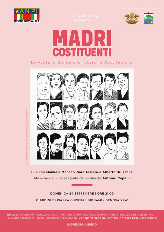 Domenica 24 settembre 2023, alle ore 21, presso i Giardini di piazza Giuseppe Bignami a Genova Pra’, la sezione locale di Anpi - Associazione Nazionale Partigiani d’Italia Sezione Genova Pra’, presenta l’evento “Madri Costituenti. Le ventuno donne che fecero la Costituzione”.