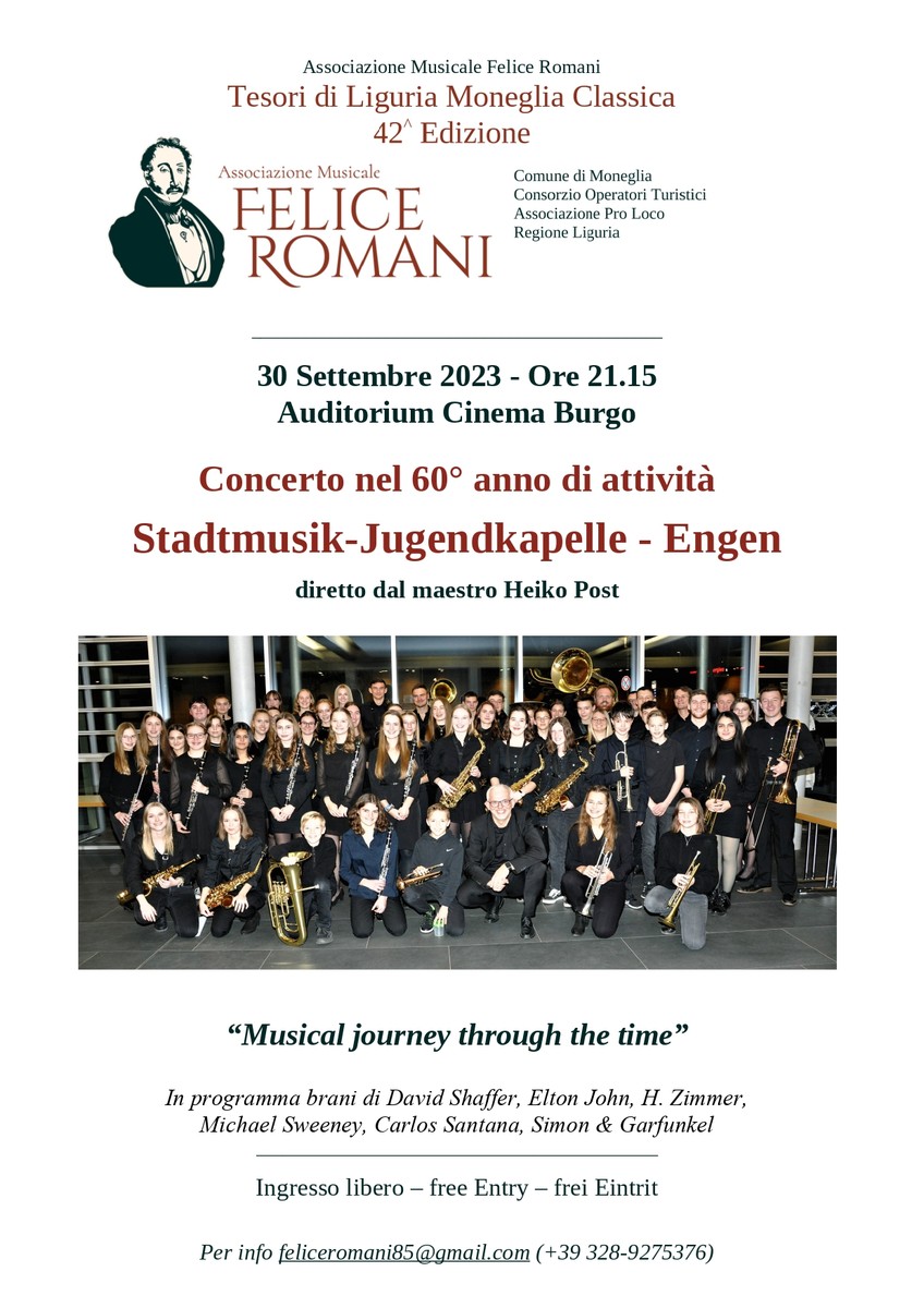 "Salutiamo il pubblico - scrivono gli organizzatori - e lo ringraziamo per la calorosa accoglienza degli eventi organizzati lungo tutta l’estate 2023 con un concerto molto speciale: 'Musical journey through the time', di The youth band of the Stadtmusik Engen, diretto dal maestro Heiko Post, in occasione del 60° anno di attività della banda giovanile. L’evento è parte delle manifestazioni legate al gemellaggio tra Moneglia e la città di Engen (Germania) che nel 2024 festeggerà i quindici anni di legame".