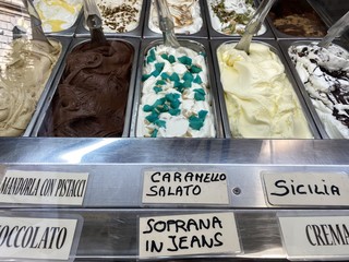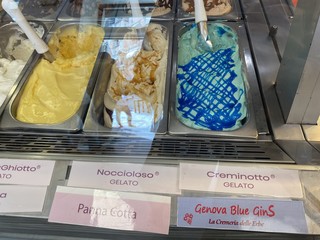 “Abbiamo preparato un gusto che di solito si chiama Soprana, in onore di porta Soprana, una crema leggera con crema pasticciera, marsala variegato con pinoli, a cui abbiamo aggiunto delle mele caramellate nel blu curaçao per dare il colore del jeans e creare un gusto a tema jeans. Tutto blu non ci piaceva, non volevamo fare il Puffo, quindi abbiamo creato questa versione un po particolare” spiega il titolare della gelateria Capriccio.