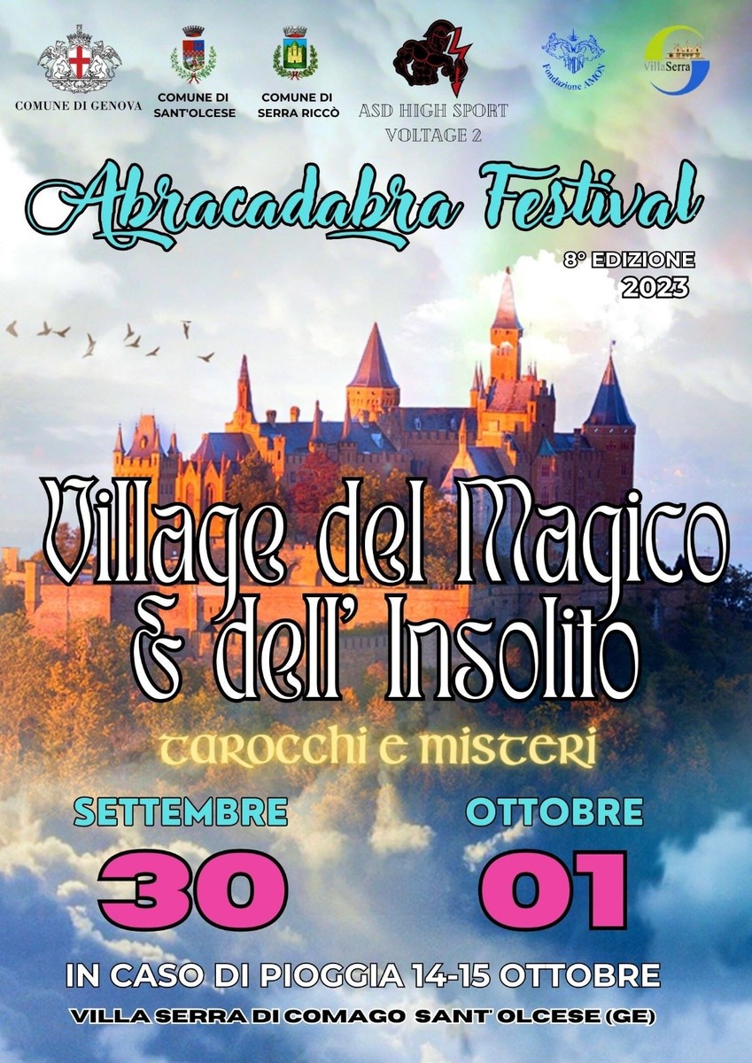 Torna anche questo Autunno, sabato 30 Settembre e domenica 1 Ottobre 2023 (in caso di mal tempo la settimana successiva ), nella suggestiva cornice del Parco di Villa Serra di Comago di Sant’Olcese (Genova), l’8° Edizione dell’ ABRACADABRA FESTIVAL “ ovvero il “Village del Magico, del Fantasy, dello Storico, del Folk del Bizzarro e dell’Insolito”.