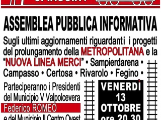 Un’assemblea pubblica per discutere insieme alla cittadinanza gli ultimi aggiornamenti riguardanti i progetti di prolungamento della metropolitana e della nuova linea merci del Campasso. Questa la nuova iniziativa organizzata dal Comitato Liberi Cittadini di Certosa per venerdì 13 ottobre alla Casa di Quartiere di via Certosa 13d, alle ore 20.30.