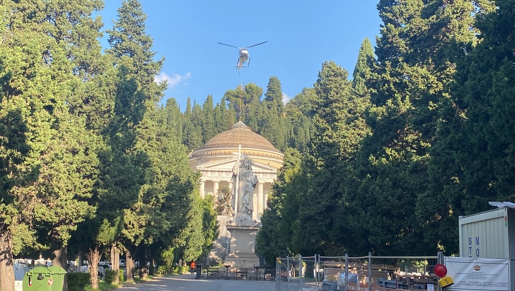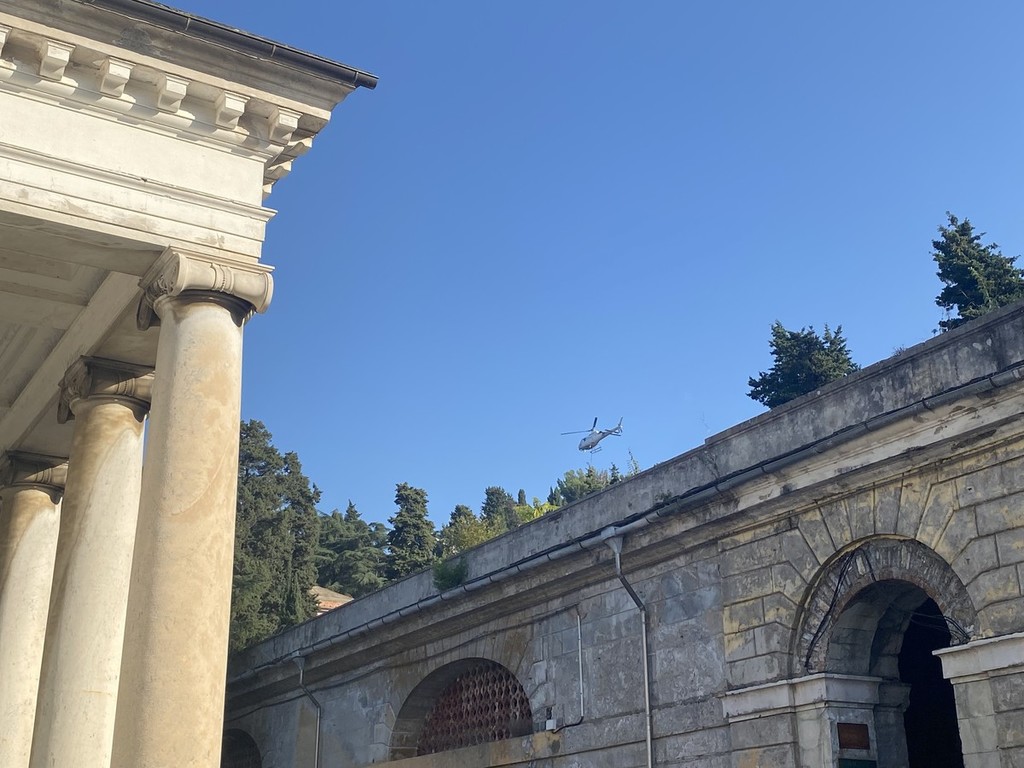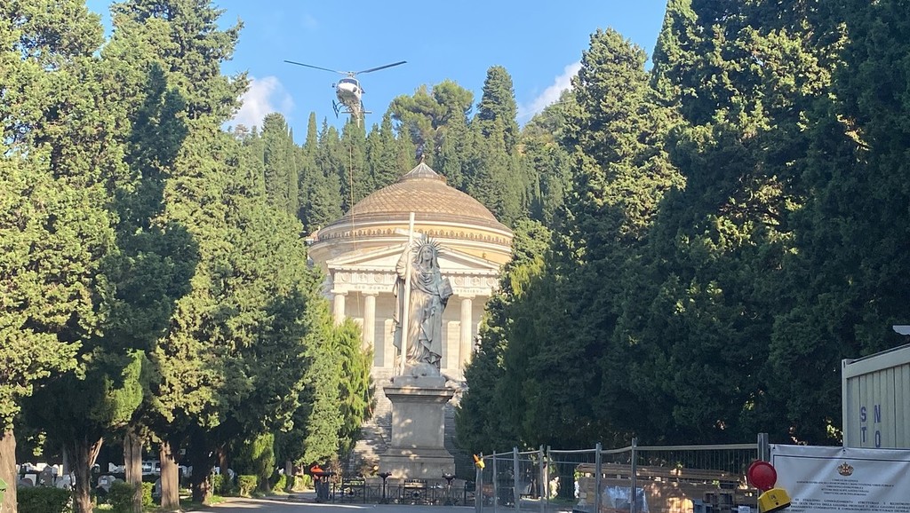 Le operazioni con l’elicottero, che hanno incuriosito passanti e visitatori del cimitero di Staglieno, andrà avanti fino alle 12, con soste ogni ora per consentire le operazioni di rifornimento di carburante nell’area allestita nella zona del Righi.