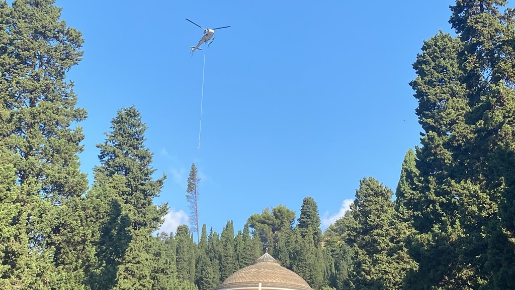 “L’area è chiusa da anni, l’obiettivo è riaprirla al pubblico per consentire le visite alle tombe dei propri cari” spiega alla Voce di Genova il dottor agronomo di A.S.Ter. Andrea Conte -. Abbiamo tagliato gli alberi malati nei giorni scorsi, e abbiamo deciso di trasportarli con l’elicottero anziché farli a pezzi per un intervento più sostenibile e rapido. Una volta terminata questa operazione si potranno iniziare i lavori per mettere in sicurezza scalinate e ringhiere, e rendere completamente accessible l’area del ‘Ventaglio’. Alcuni alberi verranno invece piantati nuovamente all’interno del cimitero di Staglieno in aree dove c’è carenza di verde, mentre quelli malati verranno distrutti”.