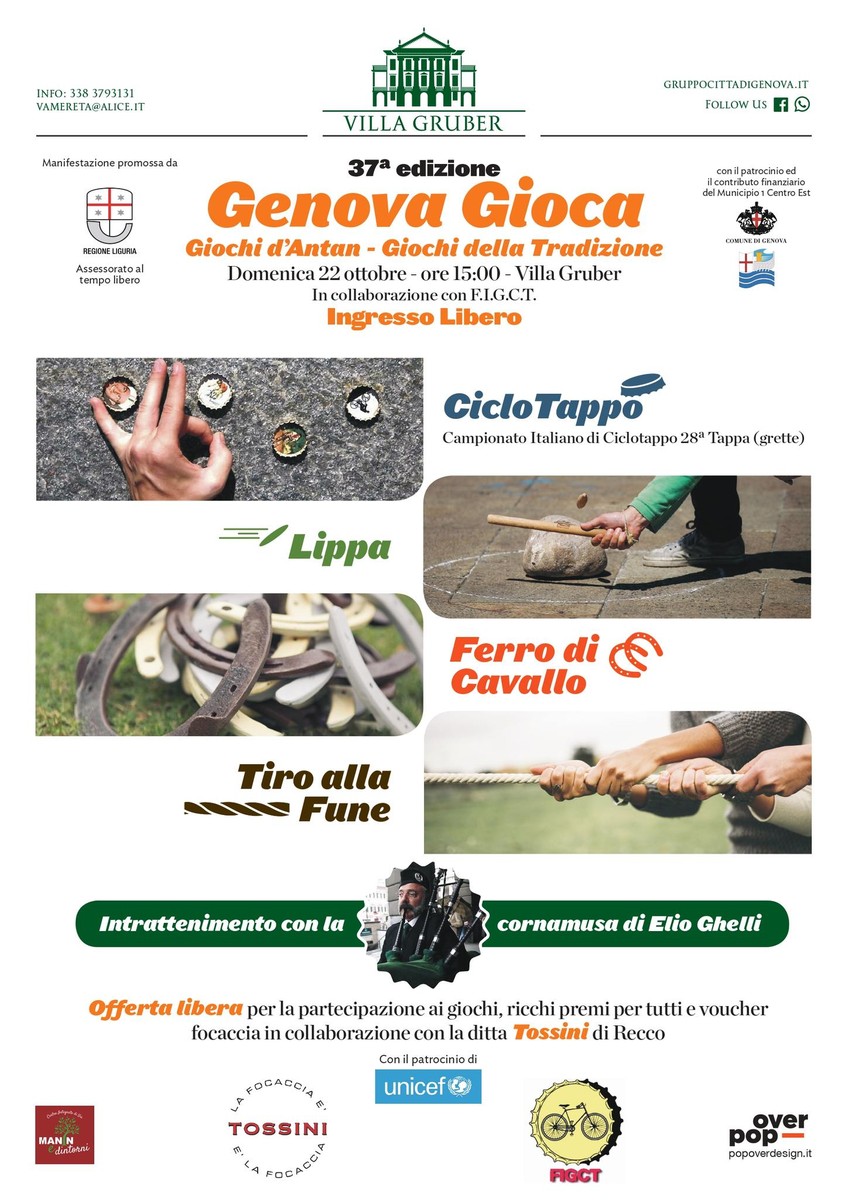Si svolgerà domenica 22 ottobre la 73esima edizione di 'Genova Gioca! Giochi d'Antan - Giochi della tradizione'. Nella cornice di Villa Gruber, a partire dalle ore 15 si terrà la 28esima tappa del Campionato Italiano di CicloTappo, ovvero la sfida a colpi di 'grette' delle bottiglie, i tornei di lippa e di ferro di cavallo e il tiro alla fune. Spazio anche alla musica con la cornamusa di Elio Ghelli. L'ingresso è libero, partecipazione aperta a tutti con offerta libera. Sono previsti premi per tutti i partecipanti.