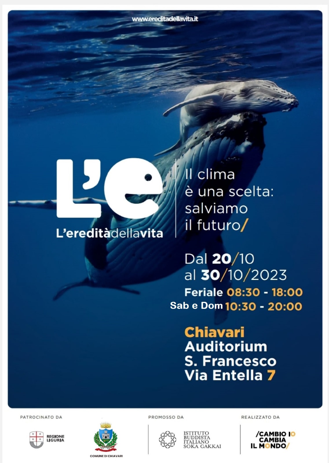Arriva a Chiavari dal 20 ottobre 2023 la mostra “L’eredità della vita”, realizzata nell’ambito della campagna “Cambio io, cambia il mondo: pensare globalmente, cambiare interiormente, agire localmente” dell’Istituto Buddista Italiano Soka Gakkai che ha come obiettivo un coinvolgimento di ogni singolo individuo sulle grandi sfide ambientali.