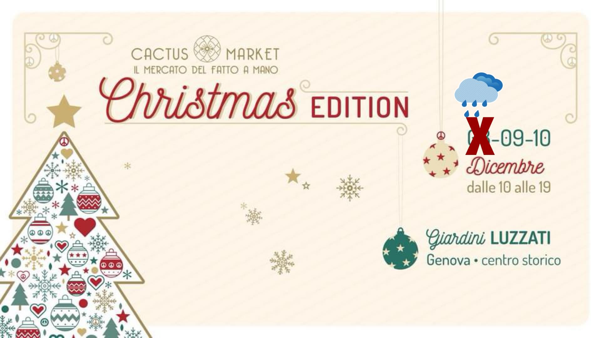 Da venerdì 8 dicembre a domenica 10 dicembre torna la Christmas Edition del Cactus Market, ai Giardini Luzzati di Genova, nel centro storico della città. Un weekend all' insegna del fatto a mano, della solidarietà, della creatività e dello stare insieme con 35 banchi di artigianato, associazioni e laboratori.
