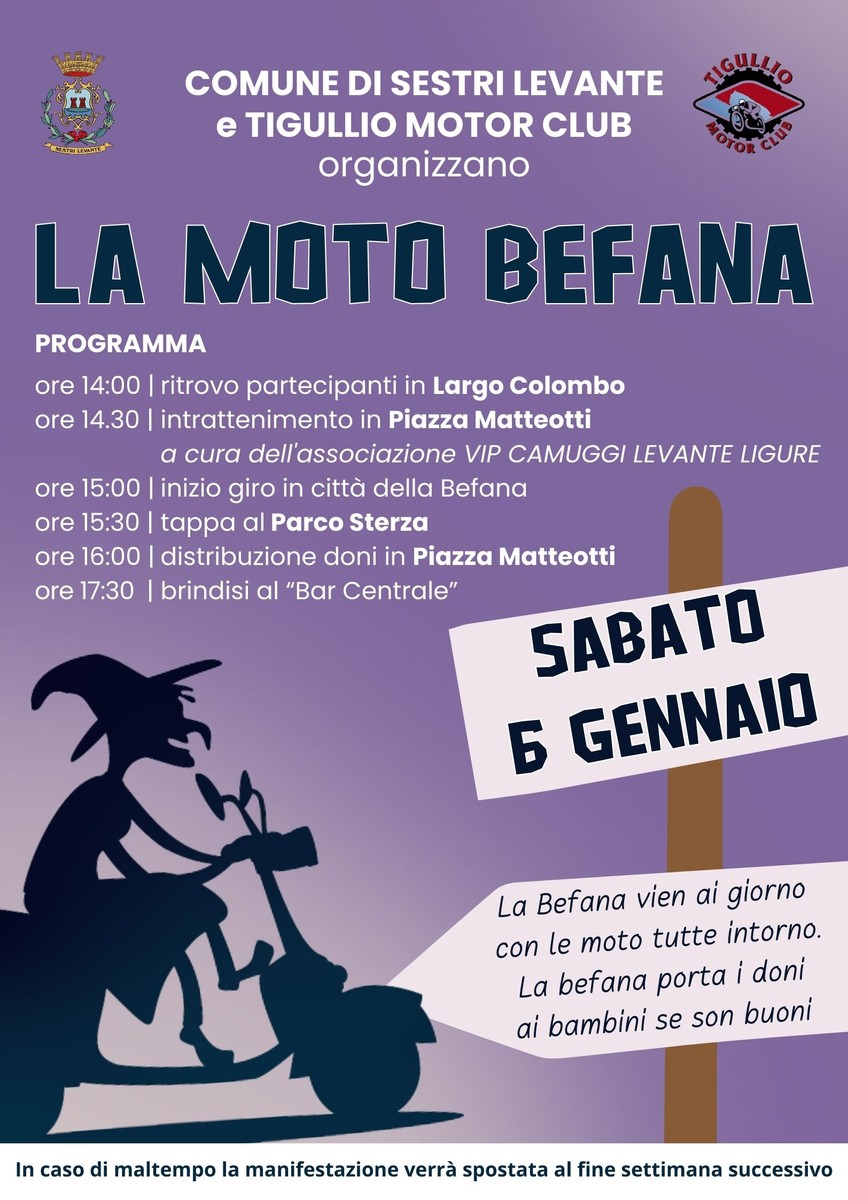 Dopo alcuni anni di assenza, torna "La Motobefana", l’iniziativa organizzata dal Comune di Sestri Levante in collaborazione con il Tigullio Motor Club per l'Epifania. Un'alternativa creativa alla tradizionale festa e un'esperienza divertente e magica per tutta la famiglia. Il 6 gennaio, gli appassionati di moto sfileranno per le strade della città, accompagnando la Befana in un insolito viaggio su due ruote anziché sulla classica scopa di saggina. Durante la sfilata, i motocicliasti in sella a moto d’epoca, distribuiranno doni e dolcetti a tutti i bambini di Sestri Levante.