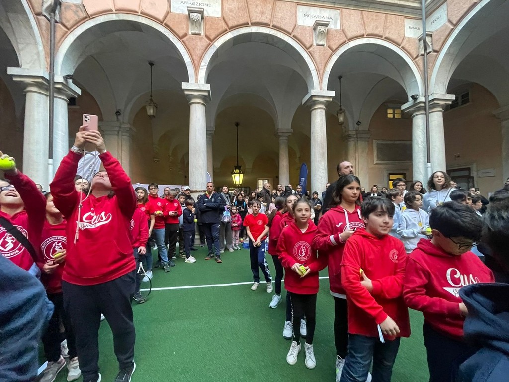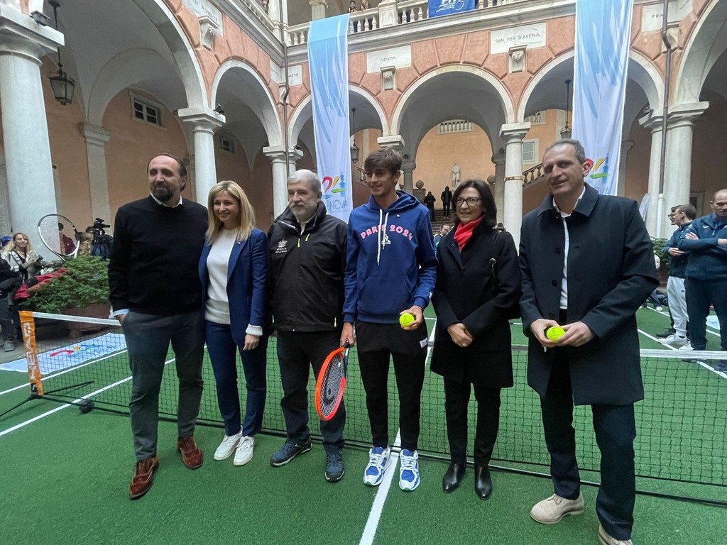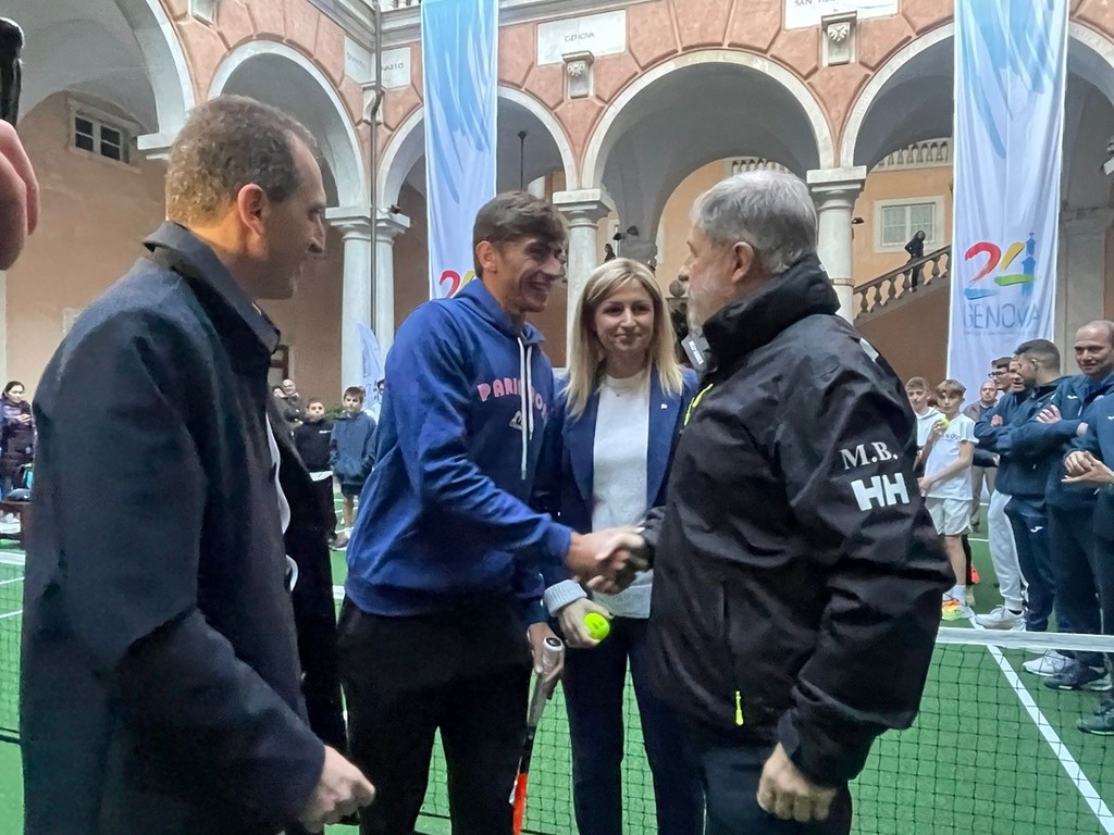 Ieri pomeriggio l’atrio di Palazzo Tursi si è trasformato in un campo da tennis per accogliere i campioni del tennis italiano Matteo Arnaldi, eroe ligure della Coppa Davis vinta dall’Italia nel 2023, e Diego Nargiso. In campo si gioca con le palline marchiate “Genova capitale dello sport 2024”, la gente fa da spettatori sul porticato di Palazzo Tursi a guardare dall’alto i palleggi come fossero sugli spalti del Foro Italico; Arnaldi gioca contro l’assessore allo Sport del Comune Alessandra Bianchi, Nargiso palleggia con decine di giovani tennisti delle scuole liguri arrivati a Tursi per conoscere i loro idoli. Il sindaco Marco Bucci regala al vincitore della Devis 2023 la spilla con la croce di San Giorgio, simbolo della città di Genova. È un pomeriggio di festa per lo sport, di grande professionismo, e di soddisfazione per una città come Genova che ha da sempre un feeling speciale con la Coppa Devis, un legame nato nel 1928, nove incontri, sette vittorie, due sole sconfitte, nel 2009 contro la Svizzera di “Sua Maestà” Roger Federer e nove anni dopo contro la Francia, poi finalista sconfitta solo dalla Croazia. Questo il bilancio, più che positivo, delle sfide disputate dalla nostra nazionale all’ombra della Lanterna.